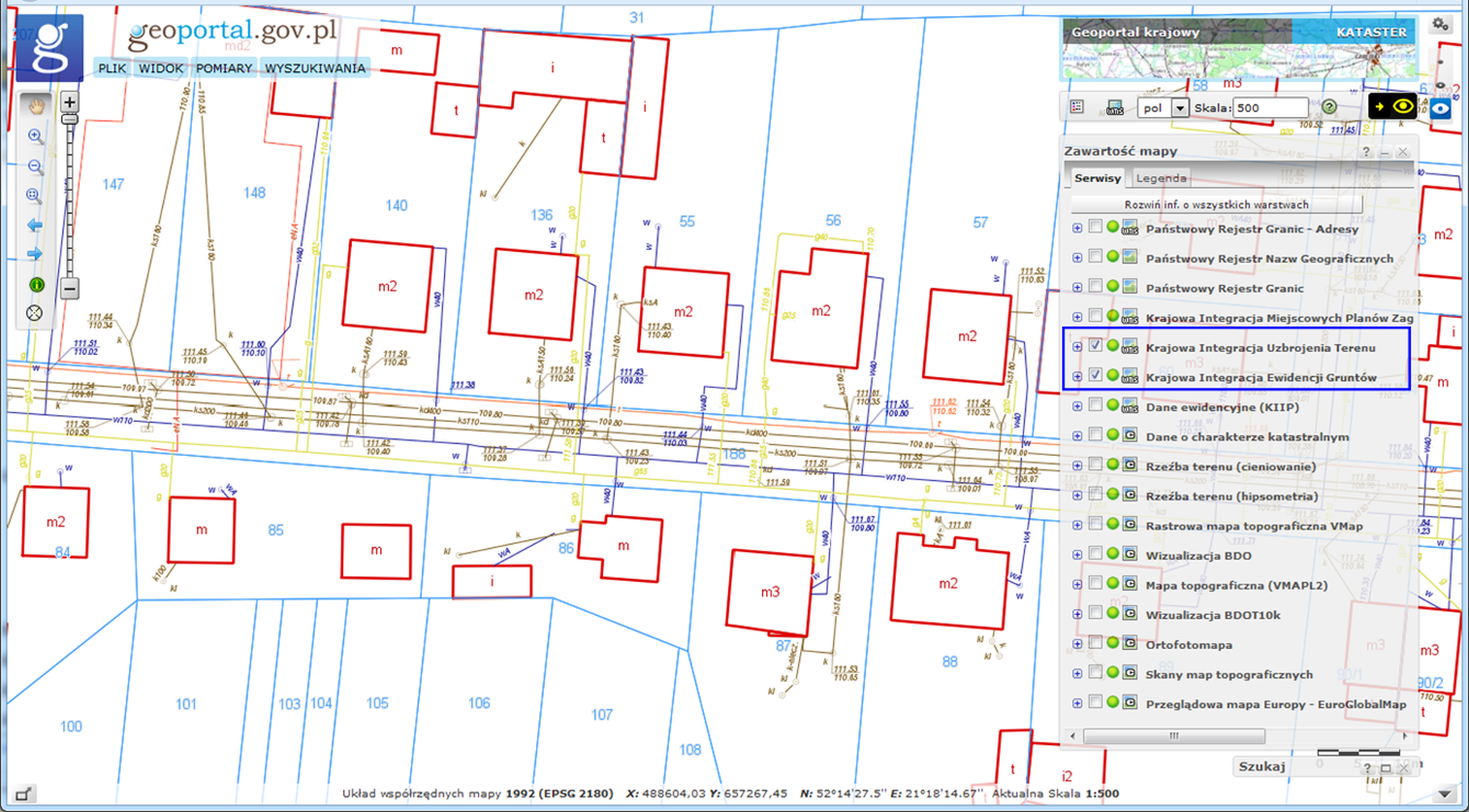 - KrajowaIntegracjaEwidencjiGruntów – najważniejsza usługa obejmująca dane ewidencji gruntów i budynków z ponad 290 powiatów. Typowy wygląd informacji publikowanej w usłudze to działki i budynki.