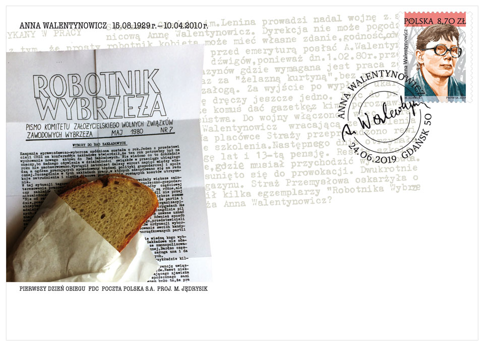 Oprócz okolicznościowego znaczka Poczta Polska wydała, w limitowanej wersji, kopertę FDC, czyli kopertę wydawaną w pierwszym dniu obiegu znaczków. Widnieje na niej wizerunek Anny Walentynowicz oraz grafika przedstawiająca jeden z numerów „Robotnika Wybrzeża”, pisma Komitetu Założycielskiego Wolnych Związków Zawodowych Wybrzeża z ułożoną na wierzchu kromką chleba. Periodyk wydawany był nieregularnie od sierpnia 1978 do maja 1980 roku. Walentynowicz wchodziła w skład redakcyjny tej gazety.