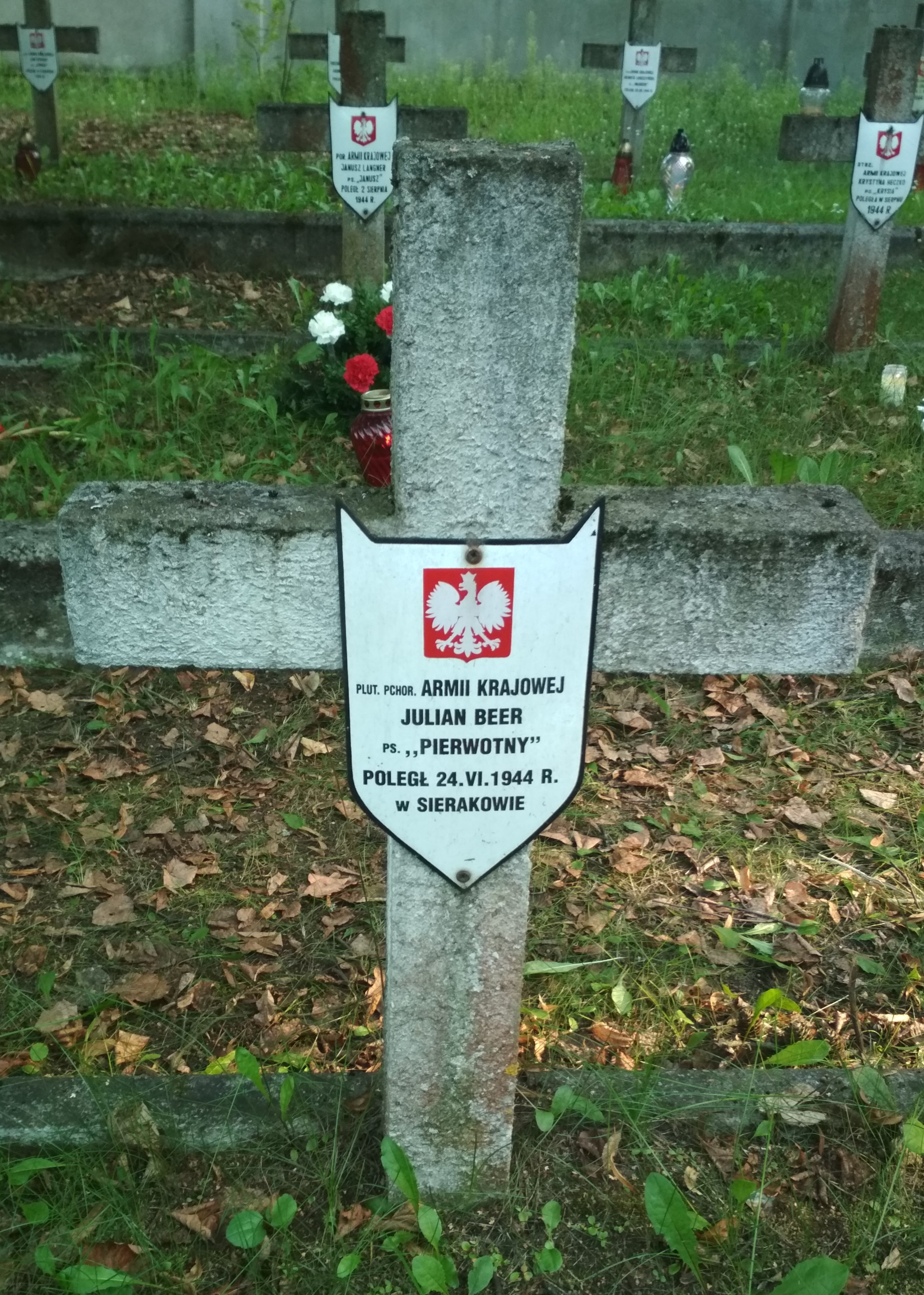 Plutonowy podchorąży Julian Beer ps. „Pierwotny” zginął 24 czerwca 1944 r. w Sierakowie w Kampinosie, w zasadzce zorganizowanej przez niemieckich żandarmów.
