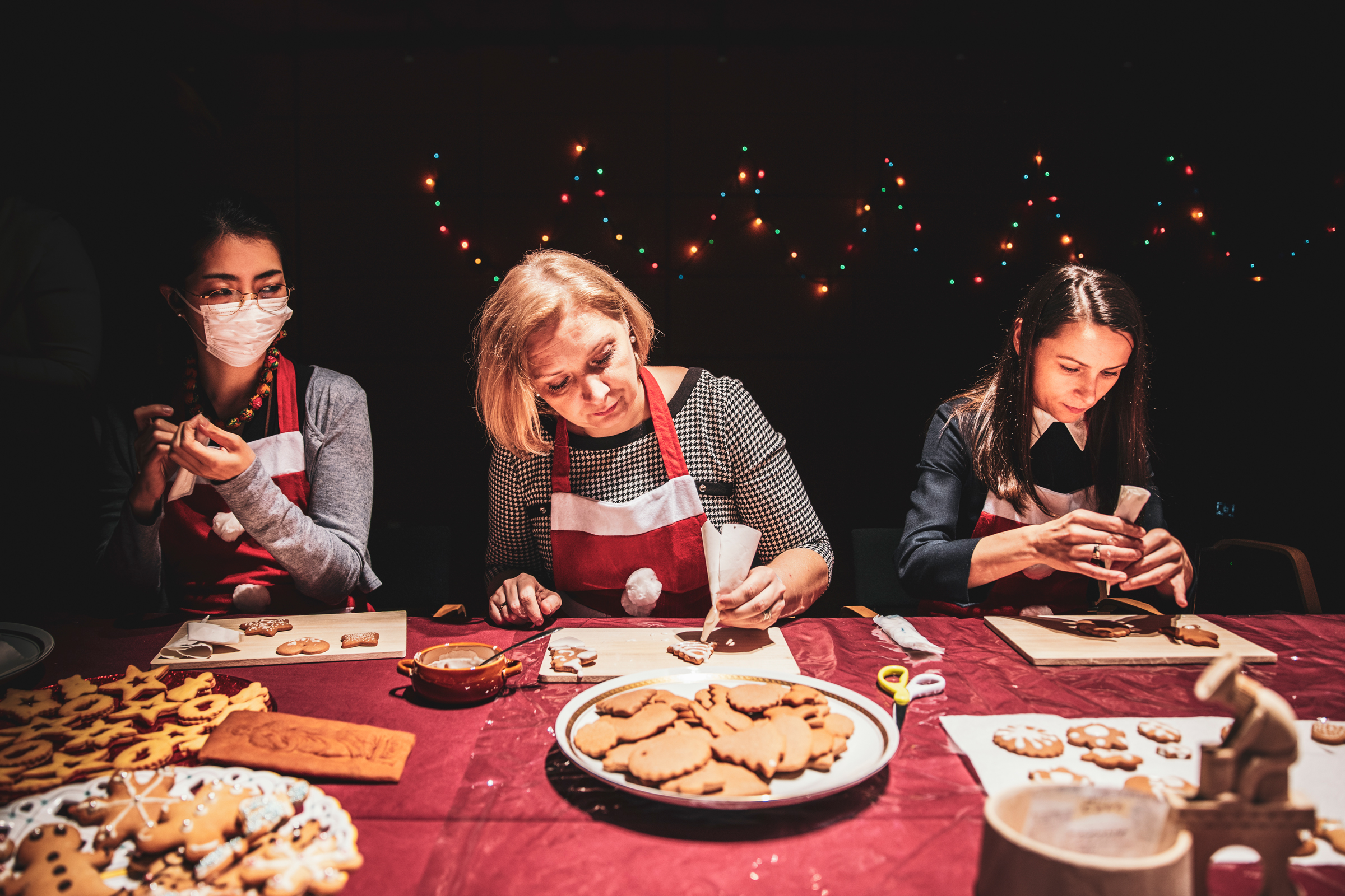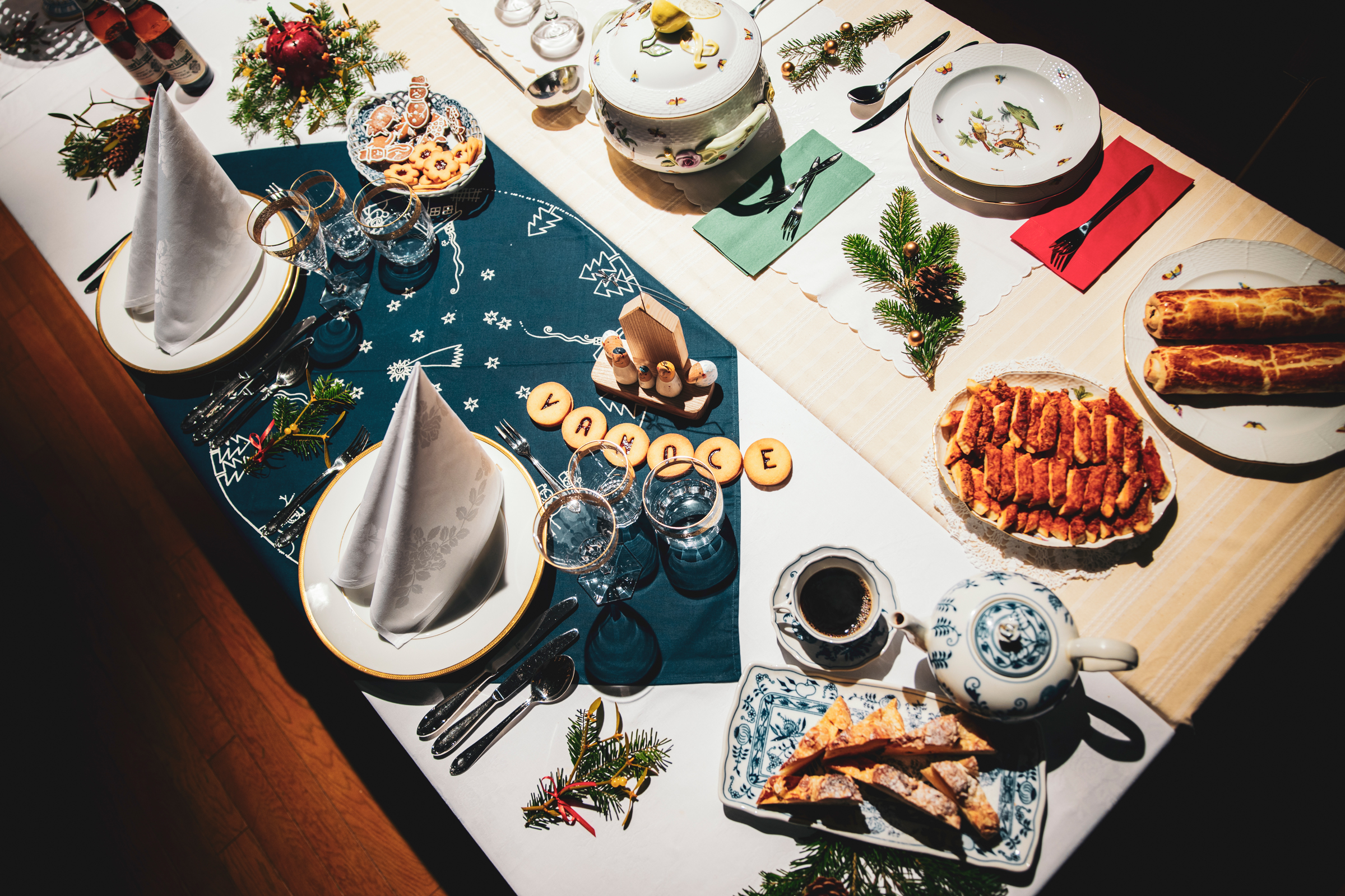 The whole family gathers to celebrate Christmas. The table is decorated with pine branches, candles, dried oranges, cinnamon sticks, and dried cloves.