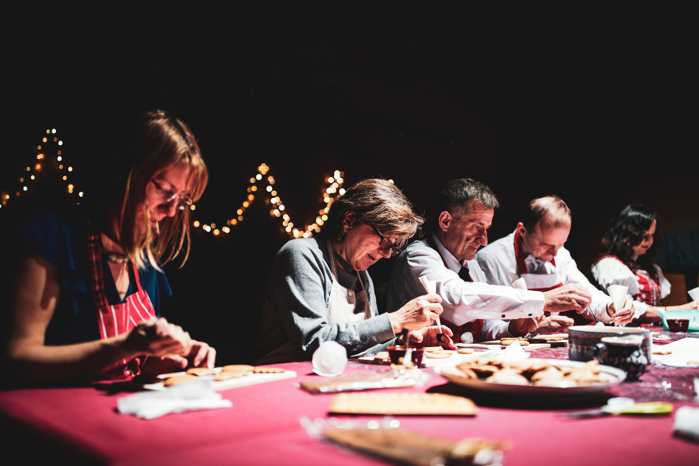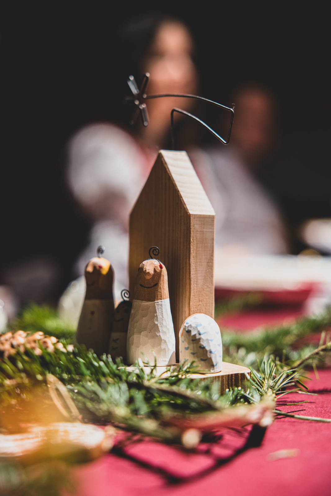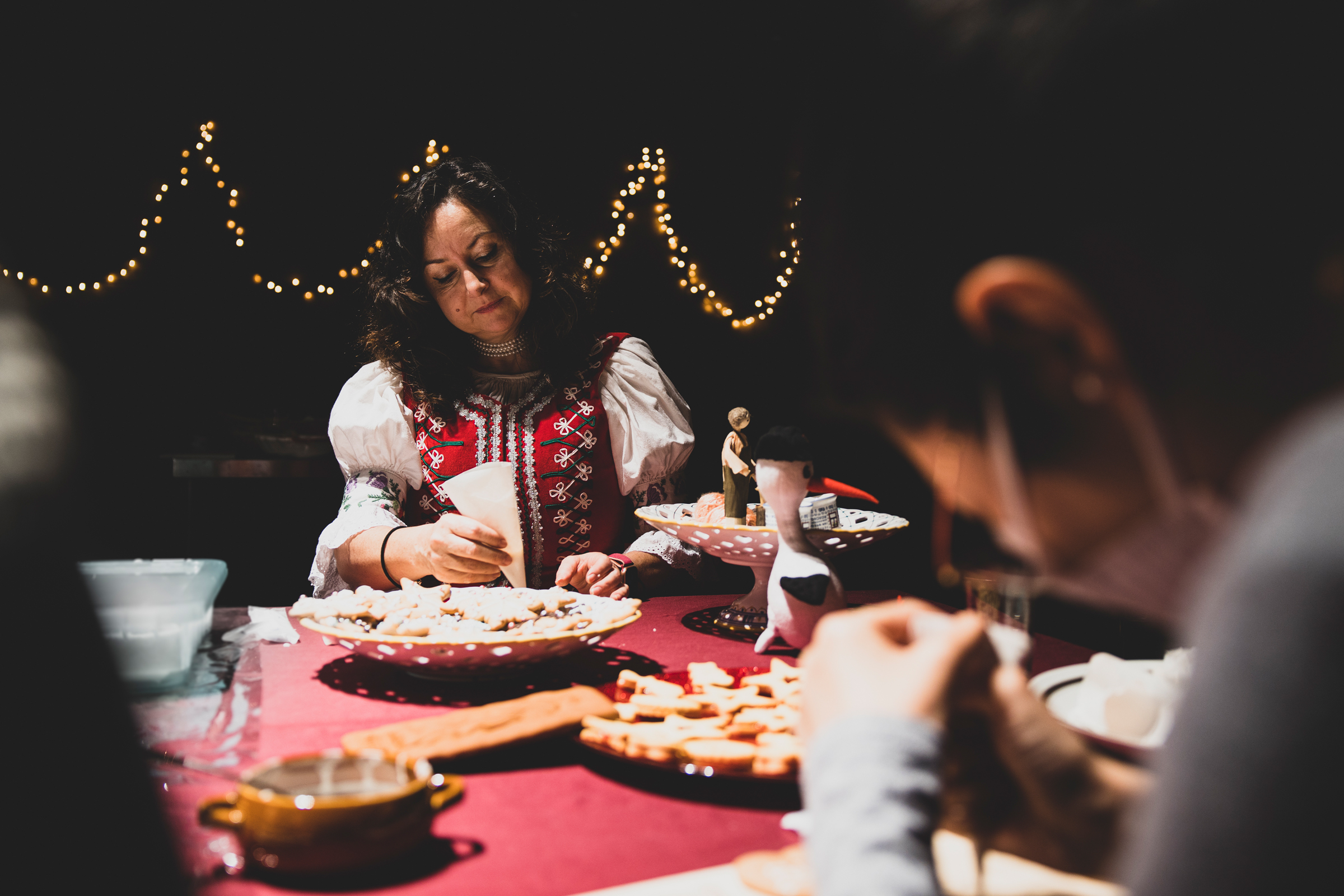 Cała rodzina zbiera się, by świętować Boże Narodzenie. Stół zdobią gałązki sosny, świece, suszone pomarańcze, laski cynamonu i suszone goździki.