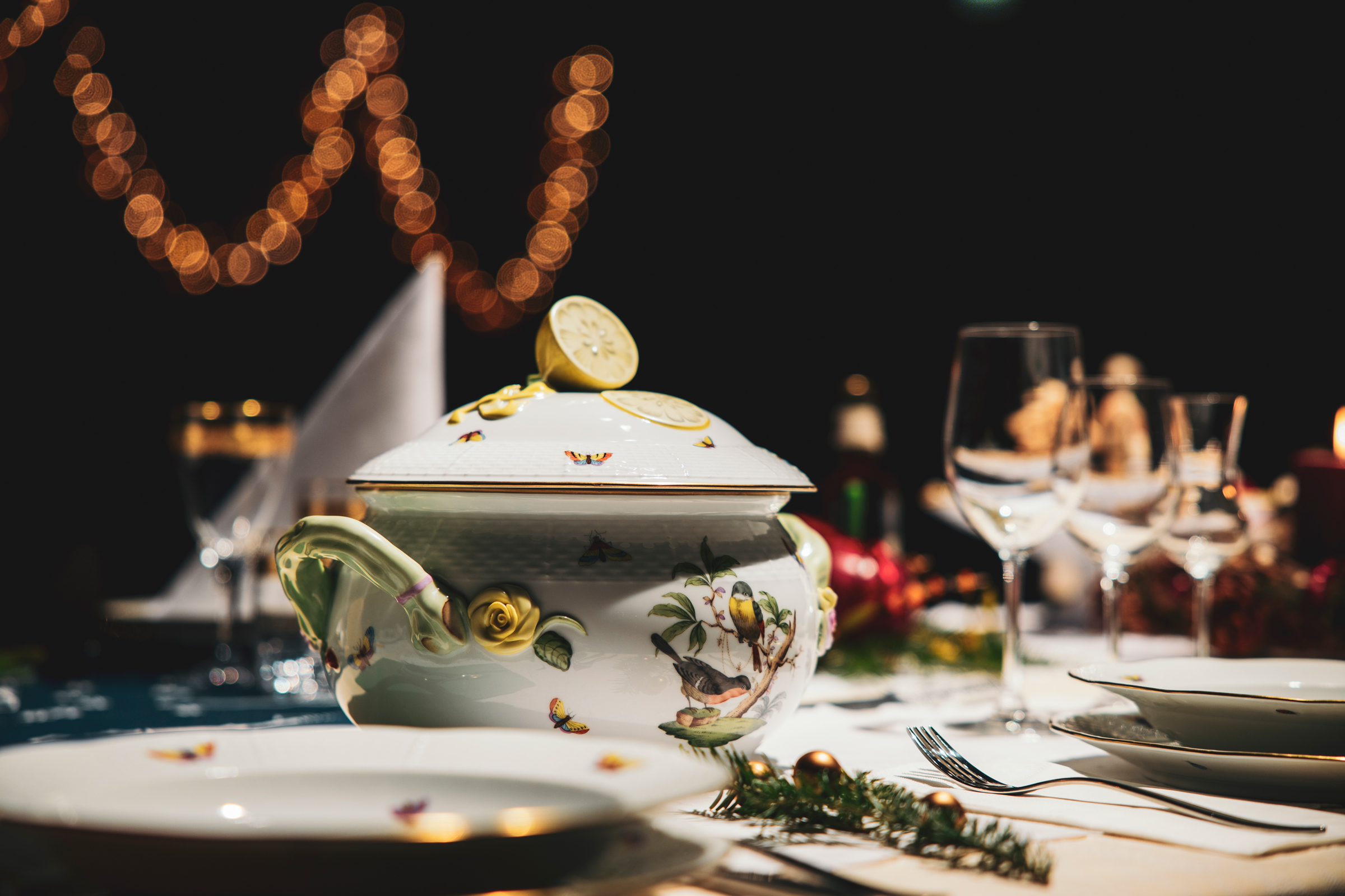 Delikatna i elegancka porcelana Herend doskonale podkreśla świąteczny nastrój. Dekoracja z jodły przypomina wieniec adwentowy, na którym umieszcza się 4 świece i na 4 tygodnie przed świętami w każdą niedzielę zapala się kolejną z nich. Na świątecznym stole często pojawiają się koronkowe serwety, z których słyną Węgry. Ozdobami stołu są też potrawy, które zawsze pojawiają się w święta: czerwona zupa rybna halaszle z dużą ilością papryki w proszku czy strucla z makiem i orzechami.