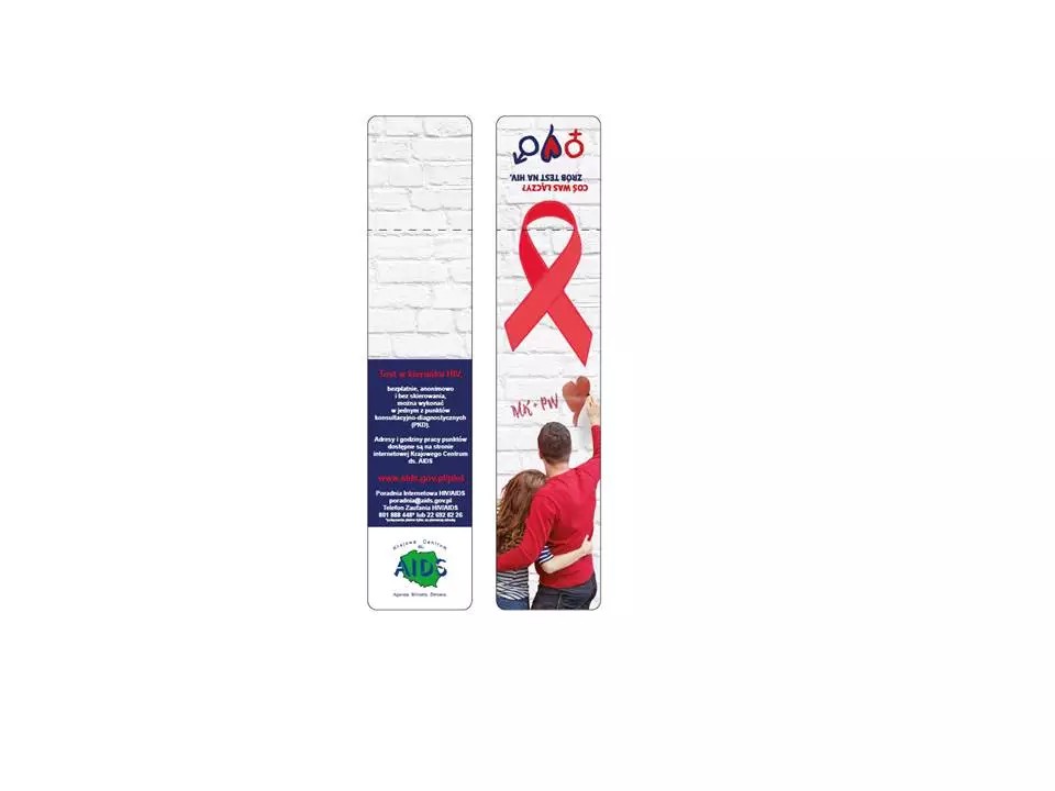Zakładka – zaprojektowana na podstawie plakatu z kampanii społecznej „Coś Was łączy? Zrób test na HIV” – informuje o możliwości wykonania testu w kierunku HIV bezpłatnie, anonimowo i bez skierowaniaw jednym z PKD. Popularyzuje także adres strony internetowej Krajowego Centrum ds. AIDS, logo KC ds. AIDS oraz symbol czerwonej kokardki, a także zachęca do skontaktowania się z Poradnią Internetową HIV/AIDS oraz Telefonem Zaufania HIV/AIDS.