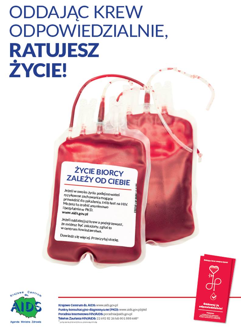 Procedura kwalifikacji dawcy i donacji jest skonstruowana tak, żeby zapobiec przetoczeniu krwi od osób chorych na choroby zakaźne, w tym zakażonych HIV. Centrum krwiodawstwa i krwiolecznictwa to nie punkt diagnostyczny – to miejsce wytwarzania leku. Badania przeglądowe są przeprowadzane bardzo czułymi metodami, ale bezpieczeństwo transfuzji zależy także od współpracy dawcy. Plakat przypomina więc, że życie biorcy zależy od dawcy. Informuje również o punktach konsultacyjno-diagnostycznych, w których można bezpłatnie, anonimowo i z poradnictwem wykonać test w kierunku HIV.