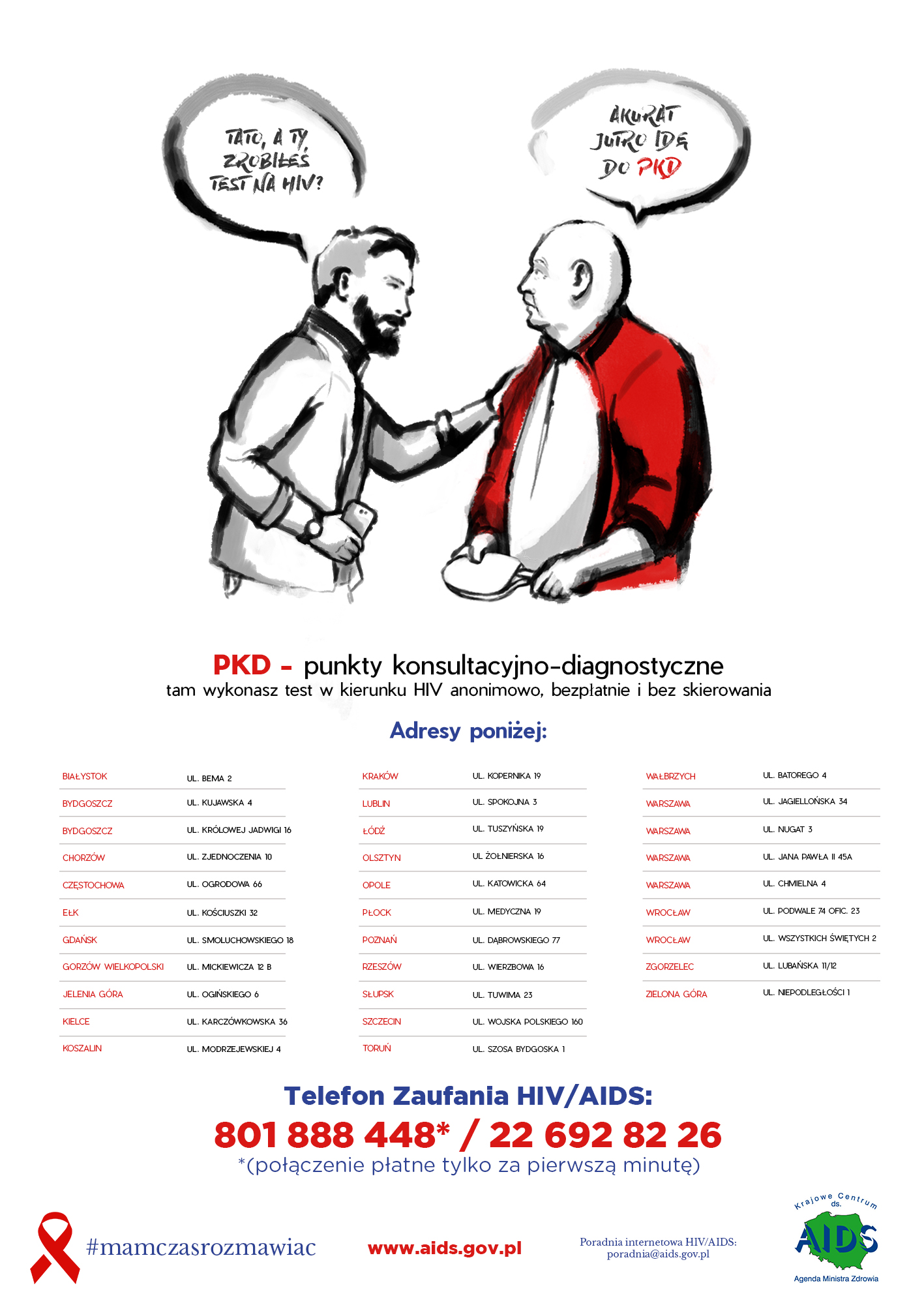 Plakat – wydany w ramach realizacji kampanii społecznej pt. „Mam czas rozmawiać (#mamczasrozmawiac)” – informuje o możliwości wykonania testu w kierunku HIV bezpłatnie, anonimowo i bez skierowania w jednym z punktów konsultacyjno-diagnostycznych (PKD), których adresy w całej Polsce podane są na plakacie. Popularyzuje także adres strony internetowej Krajowego Centrum ds. AIDS, logo KC ds. AIDS, a także zachęca do skontaktowania się z Poradnią Internetową HIV/AIDS oraz Telefonem Zaufania HIV/AIDS.