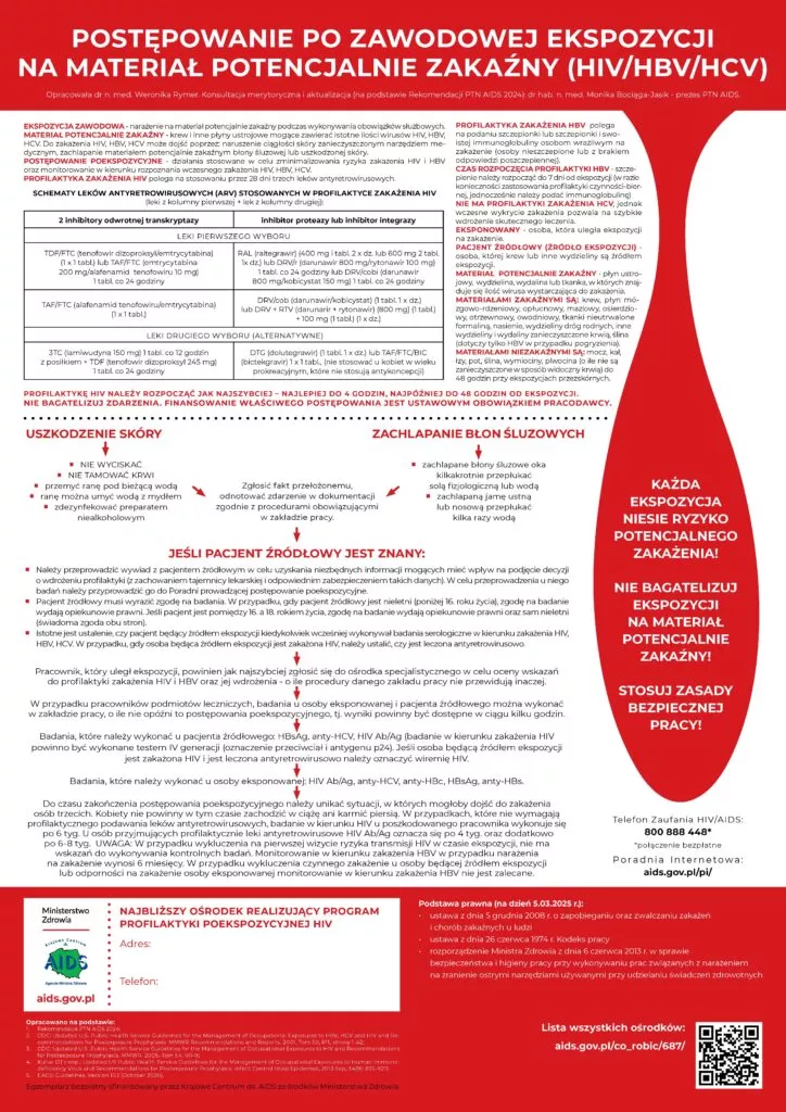 Każda ekspozycja zawodowa niesie ryzyko potencjalnego zakażenia, dlatego nie można bagatelizować ekspozycji na materiał potencjalnie zakaźny. W związku z potrzebą podnoszenia poziomu świadomości i wiedzy środowisk medycznych oraz innych grup zawodowych narażonych na ryzyko zawodowej ekspozycji na materiał potencjalnie zakaźny (HIV/HBV/HCV), Krajowe Centrum ds. AIDS zaktualizowało plakat dotyczący postępowania poekspozycyjnego. Plakat zawiera informacje o tym, kiedy może dojść do zakażenia HIV w czasie ekspozycji zawodowej. Znajdują się tu również informacje, jak należy postępować przy podejrzeniu zakażenia HBV, HCV i HIV podczas ekspozycji zawodowej, w tym bezpośredni link i kod QR do listy placówek medycznych realizujących program leczenia ARV.