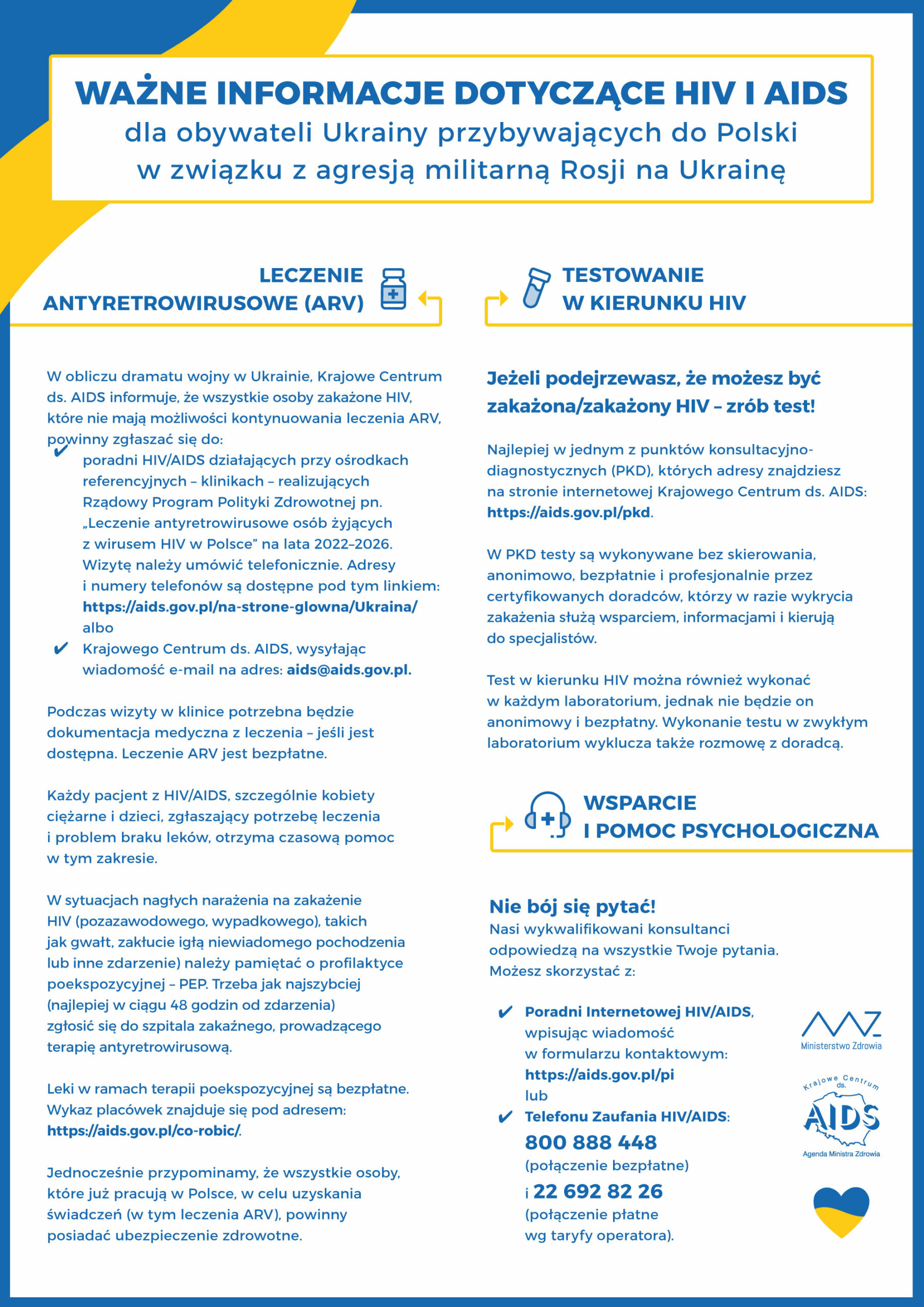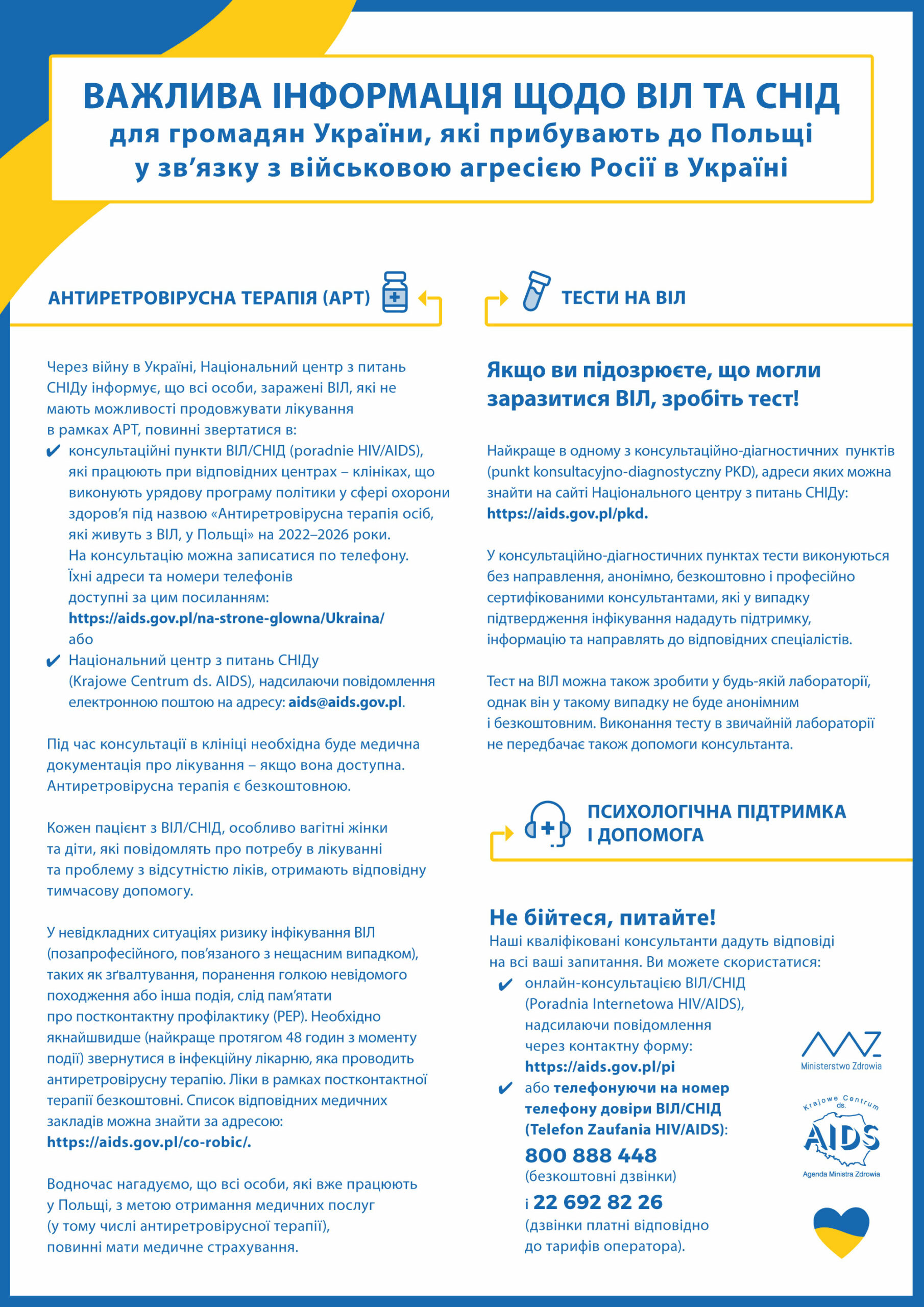 Informacja o testowaniu i leczeniu ARV dla uchodźców wojennych z Ukrainy / Інформація про тестування на ВІЛ та АРВ-терапію для воєнних біженців з України.