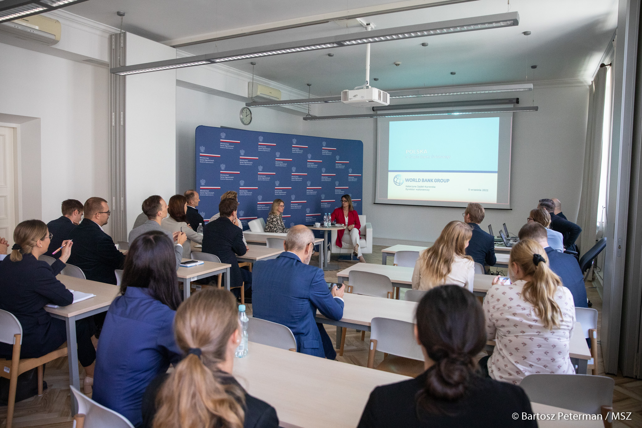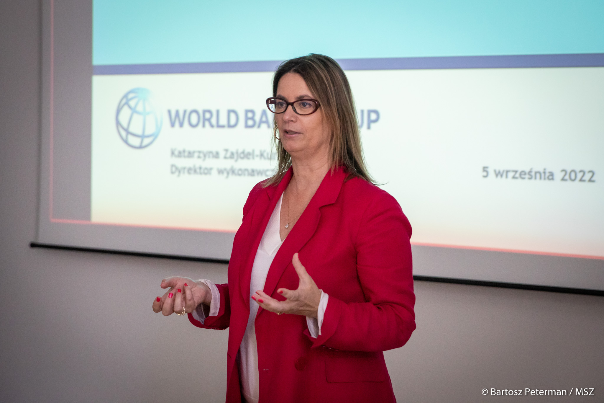 Następnie Pani Dyrektor wygłosiła wykład dla słuchaczy aplikacji dyplomatyczno-konsularnej i pracowników MSZ. Dyrektor Zajdel-Kurowska mówiła m.in. o możliwościach zatrudnienia w Banku Światowym, a także o tym dlaczego, pomimo nazwy, Bank Światowy nie jest bankiem, a instytucją rozwoju.