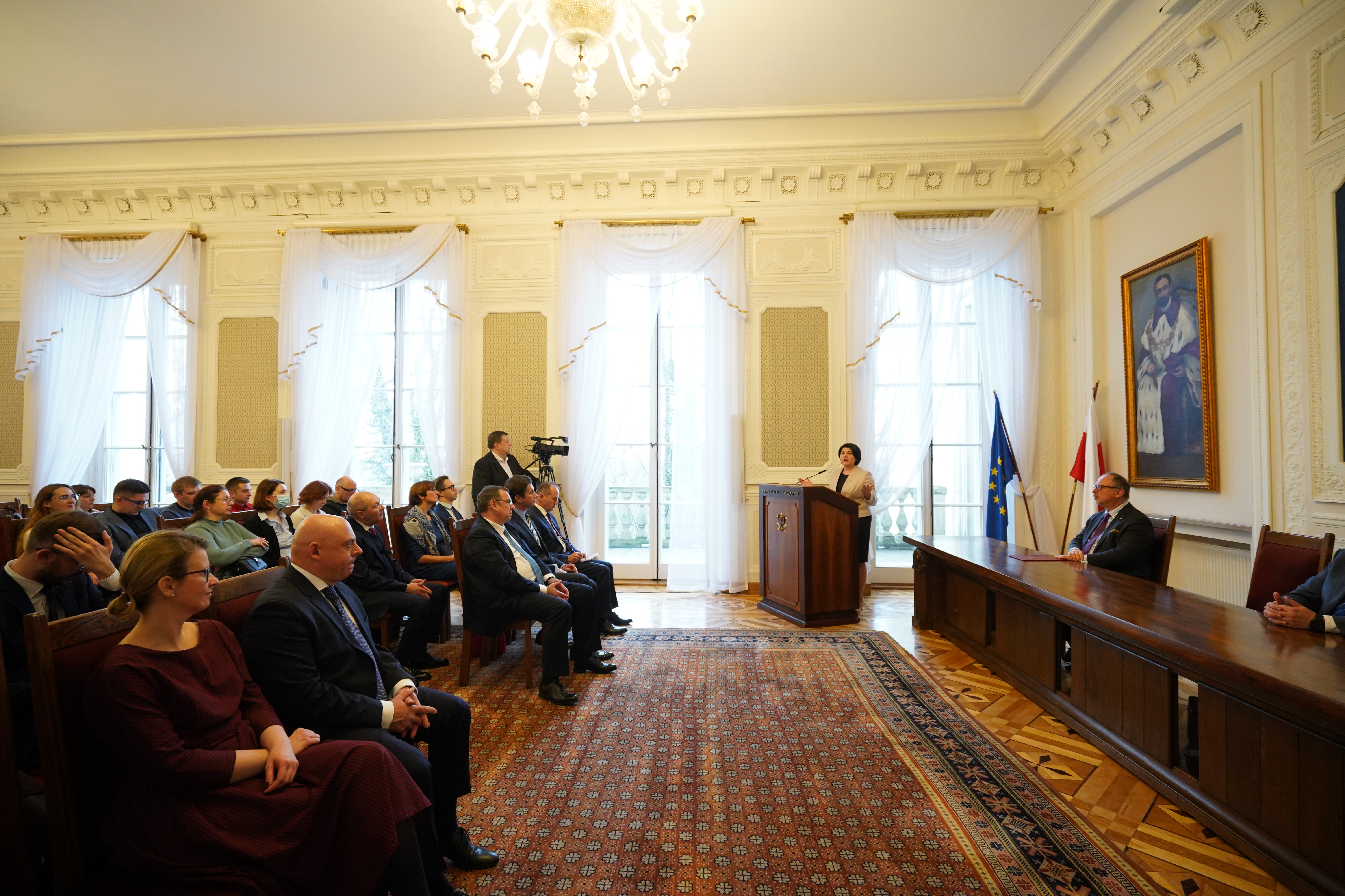 W uroczystości udział wziął również dr hab. Arkady Rzegocki, Szef Służby Zagranicznej, kierujący Akademią Dyplomatyczną MSZ. – Mołdawia zawsze może liczyć na wsparcie ze strony polskiej. Jesteśmy solidarni z Mołdawią i każdym krajem, który odznacza się taką samą jak wy determinacją do stania się członkiem wspólnoty wolnych i demokratycznych państw. Jako dyrektor Akademii Dyplomatycznej chciałem oznajmić, że wspólnie z Studium Europy Wschodniej UW przygotowaliśmy specjalny program szkoleniowy dla mołdawskich dyplomatów – powiedział Szef Służby Zagranicznej.