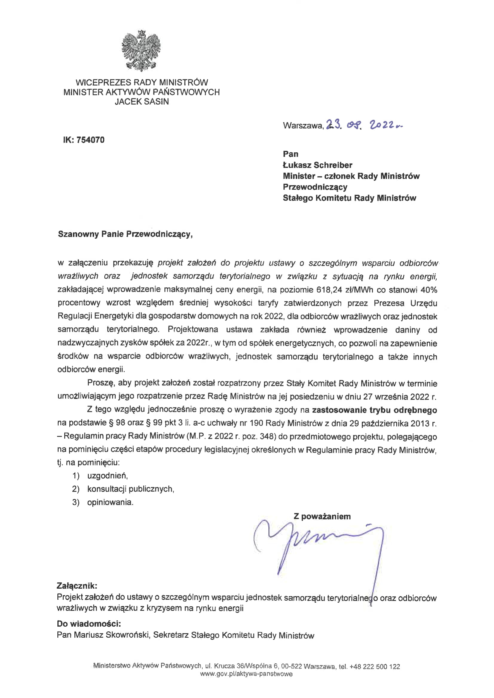 Od wielu miesięcy na rynkach surowców energetycznych mamy do czynienia z niezwykle ciężką i pogłębiającą się sytuacją. Ceny surowców energetycznych biją rekordy. Jest to efekt splotu wielu niekorzystnych czynników, na które nie mamy wpływu. W szczególności chodzi o agresję Rosji na Ukrainę i świadome działania Moskwy obliczone na destabilizację rynku, ale także nieracjonalne w tej sytuacji działania instytucji UE związane z zaostrzającą się polityką klimatyczną.