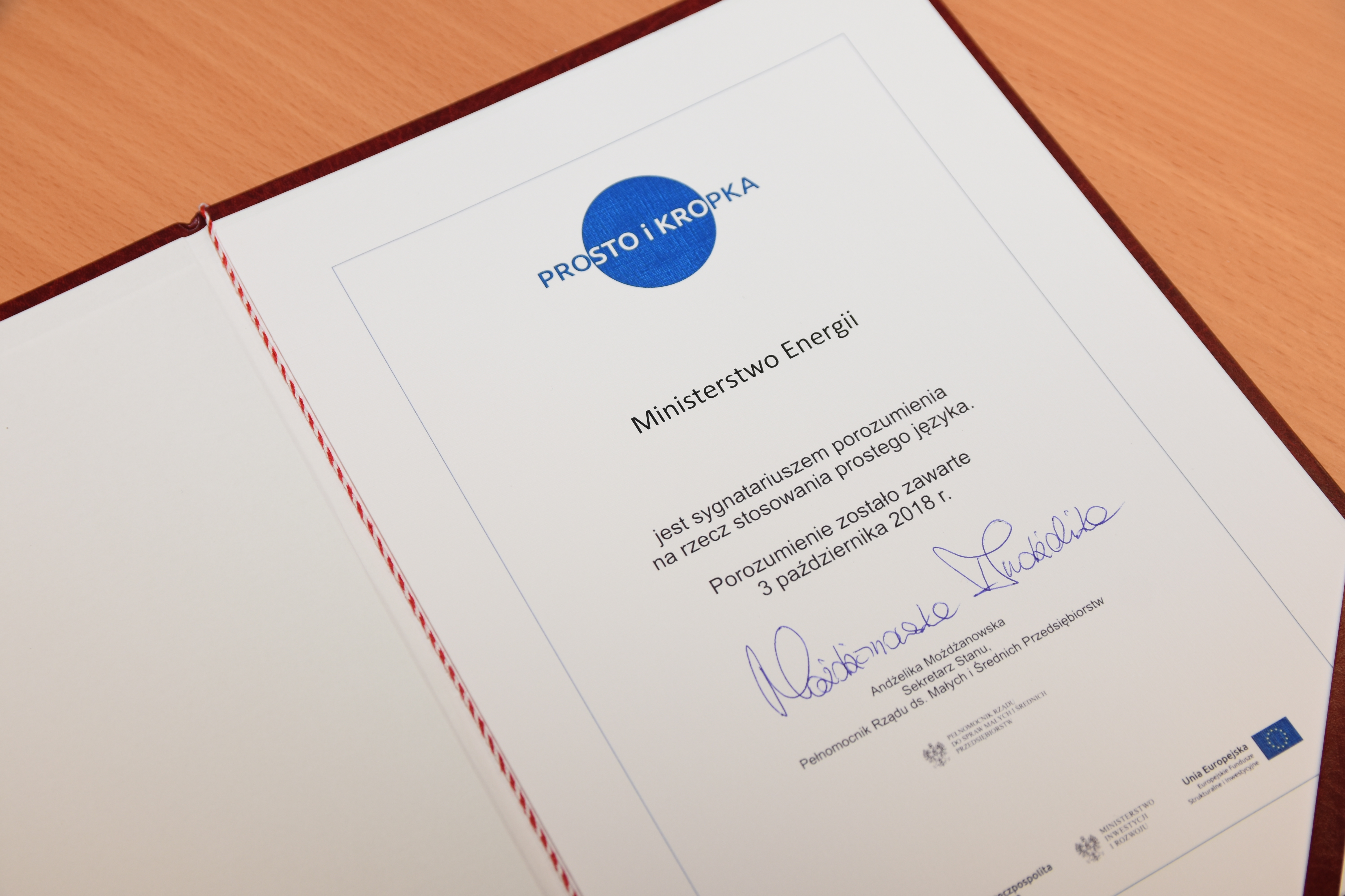 Dyrektor Generalny ME, w imieniu Ministra Energii, podpisał 3 października 2018 r. deklarację o współpracy na rzecz stosowania prostego języka w administracji.