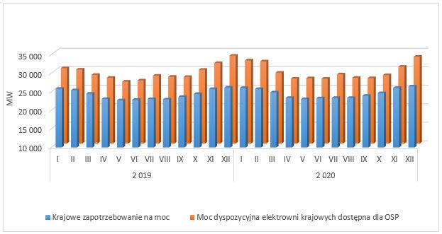 Po zaznajomieniu się z prezentacją OSP Minister Energii oraz Pełnomocnik Rządu ds. Strategicznej Infrastruktury Energetycznej informują, że dostępna nadwyżka mocy w Krajowym Systemie Elektroenergetycznym w roku 2019 i 2020 wyniesie średnio 4900 MW, czyli ok. 20% krajowego zapotrzebowania. W związku z tym ryzyko niezbilansowania krajowego systemu elektroenergetycznego w latach 2019 i 2020 jest istotnie niższe niż prognozowane przez URE. Zbilansowanie systemu zależy w dużej mierze od terminowego oddawania do eksploatacji nowobudowanych i modernizowanych jednostek wytwórczych. Na poniższym wykresie przedstawiono prognozę krajowego zapotrzebowania na moc oraz moc dyspozycyjną krajowych elektrowni.