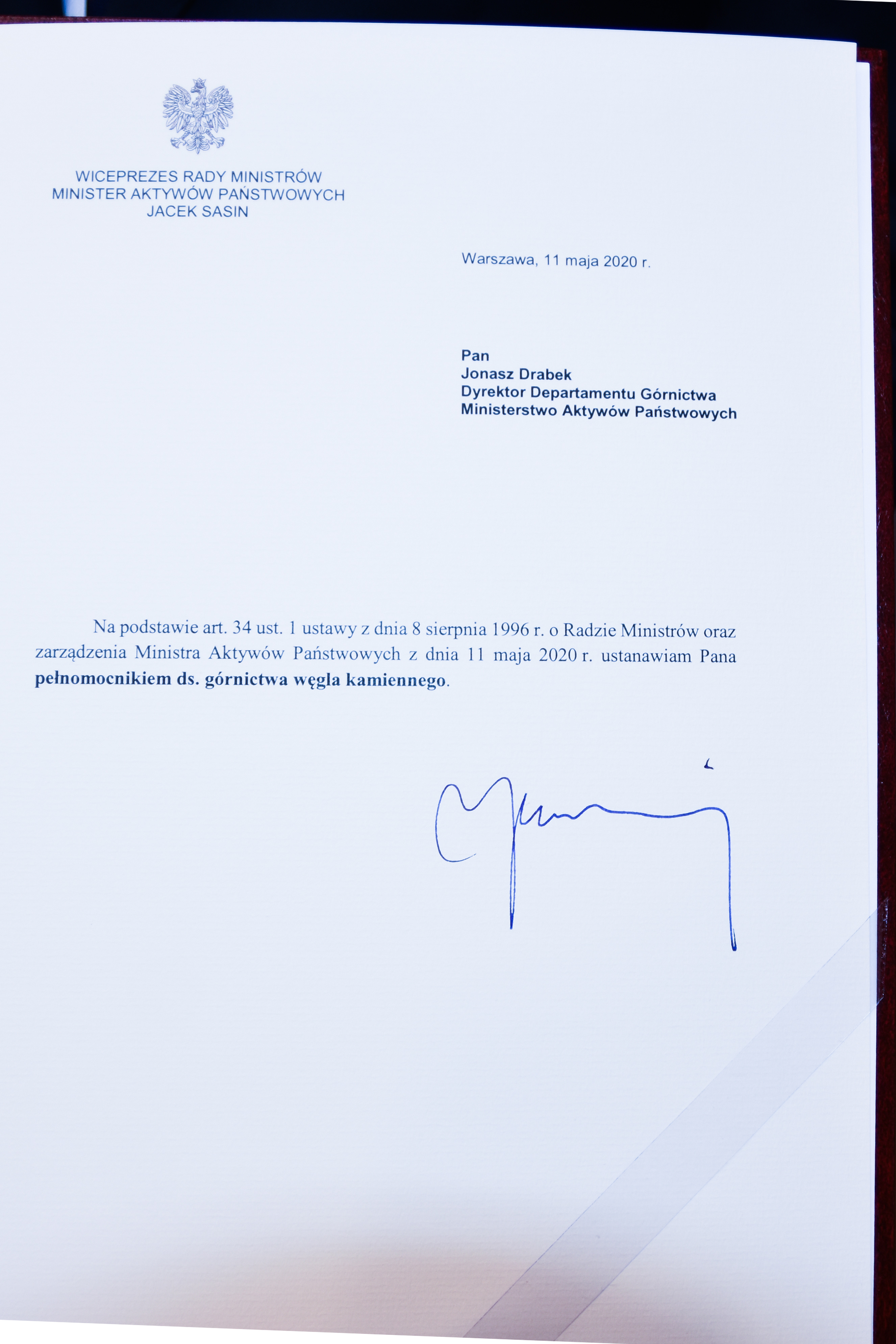 Wicepremier, Minister Aktywów Państwowych Jacek Sasin powołał z dniem 11 maja 2020 r. Jonasza Drabka na pełnomocnika ds. górnictwa węgla kamiennego.