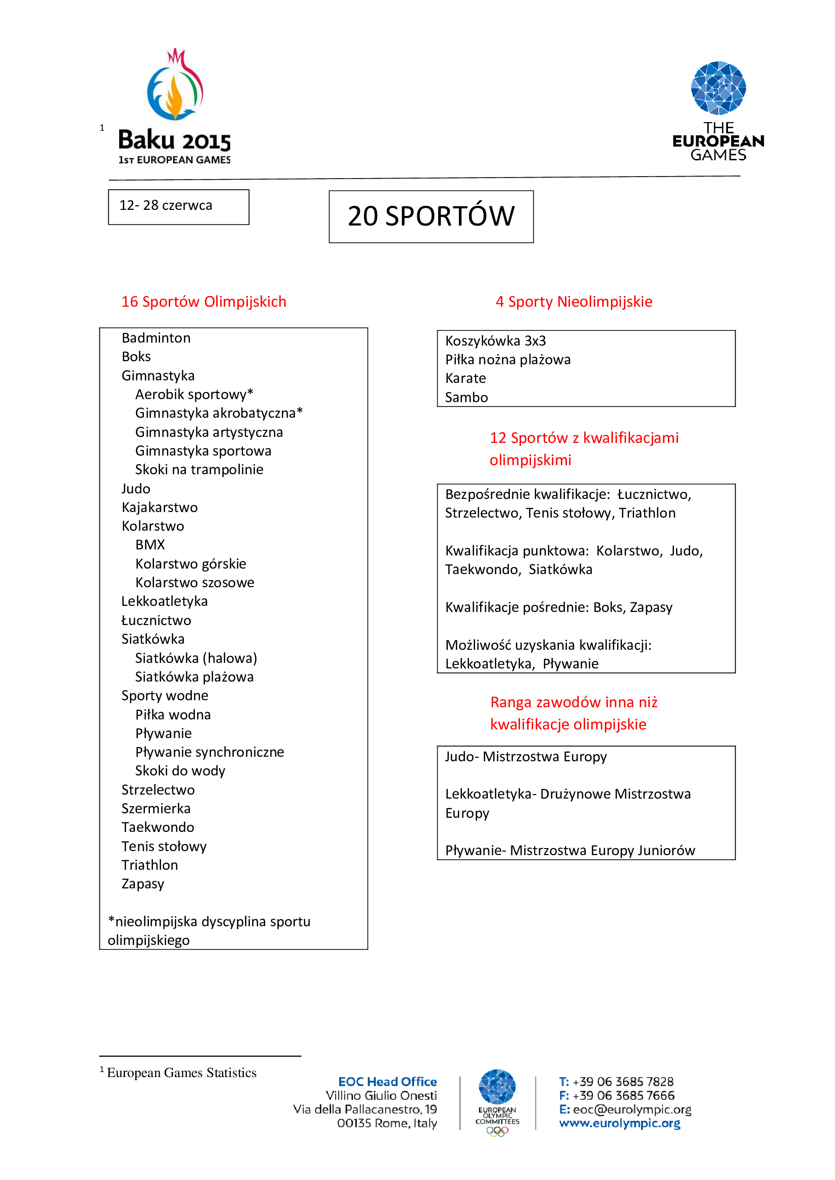 Inauguracyjna edycja Igrzysk Europejskich 2015 odbyła się w Baku w dniach 12-28 czerwca 2015 roku. W imprezie wzięło udział 6 067 sportowców z 50 krajów. Rywalizacja odbyła się w następujących sportach: