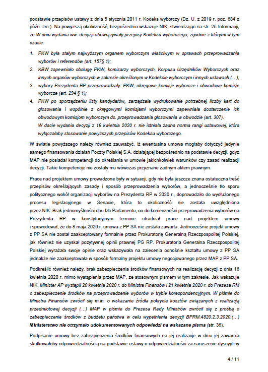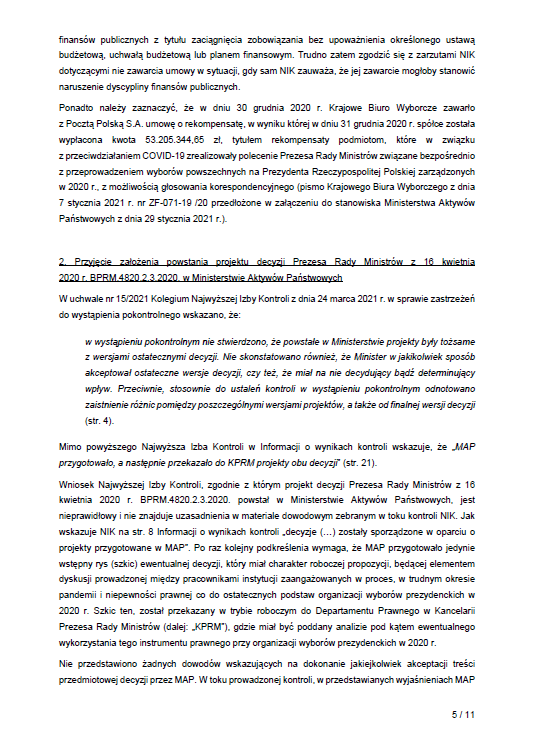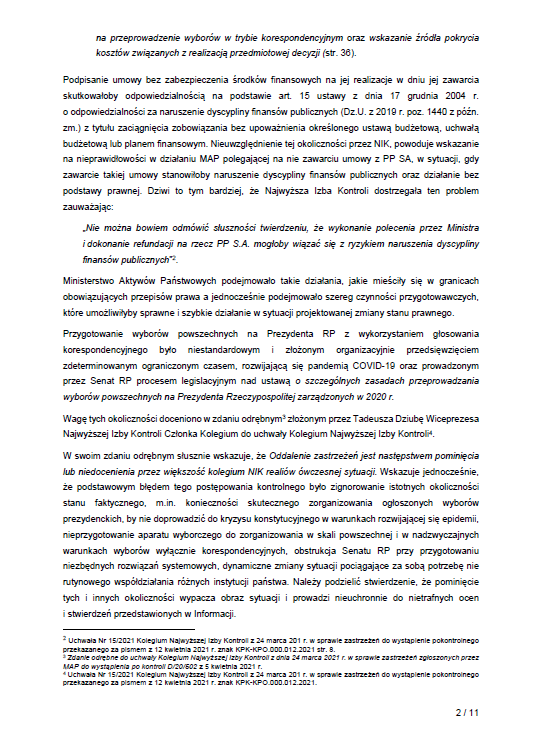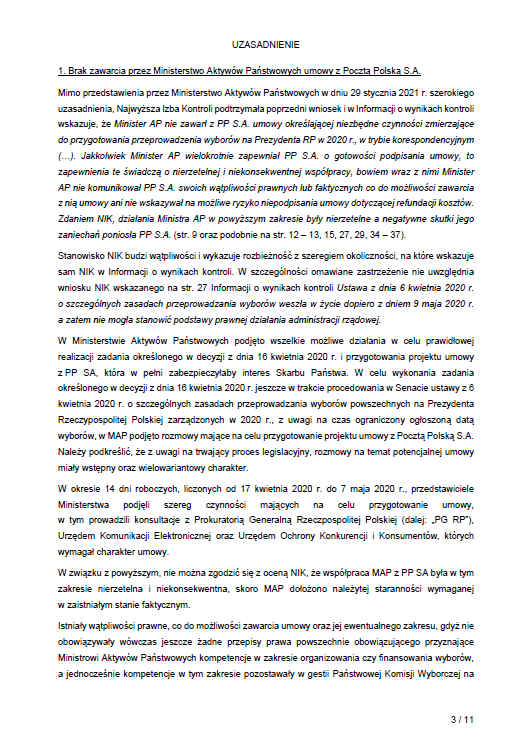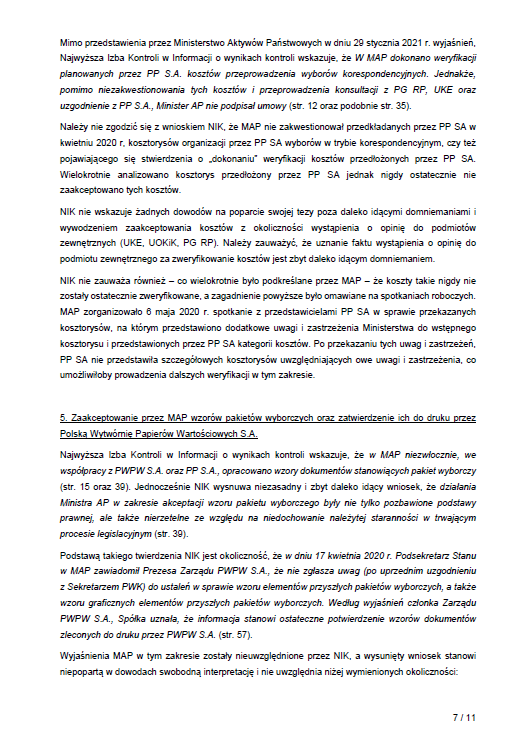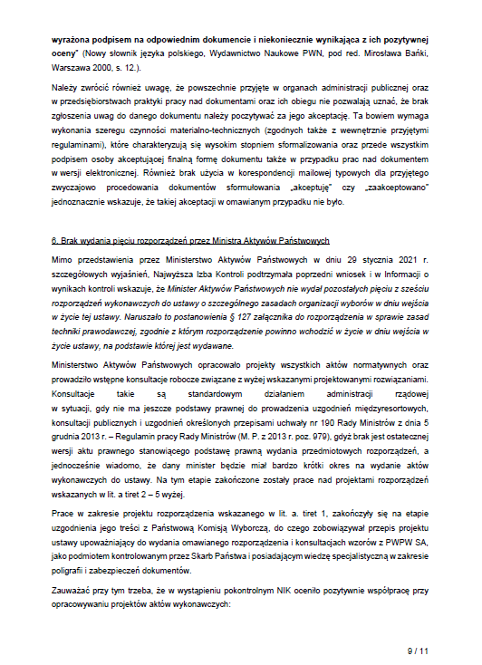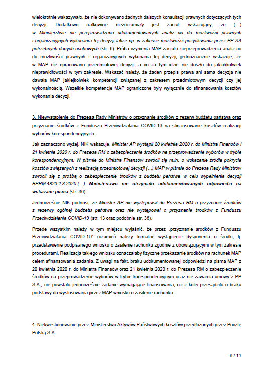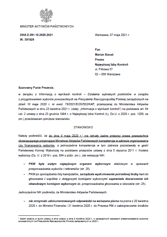 W związku z publikacją raportu Najwyższej Izby Kontroli, dotyczącego działań wybranych podmiotów związanych z przygotowaniem wyborów Prezydenta RP zarządzonych na 10 maja 2020 r. poniżej publikujemy stanowisko przesłane przez Ministerstwo Aktywów Państwowych do Najwyższej Izby Kontroli.