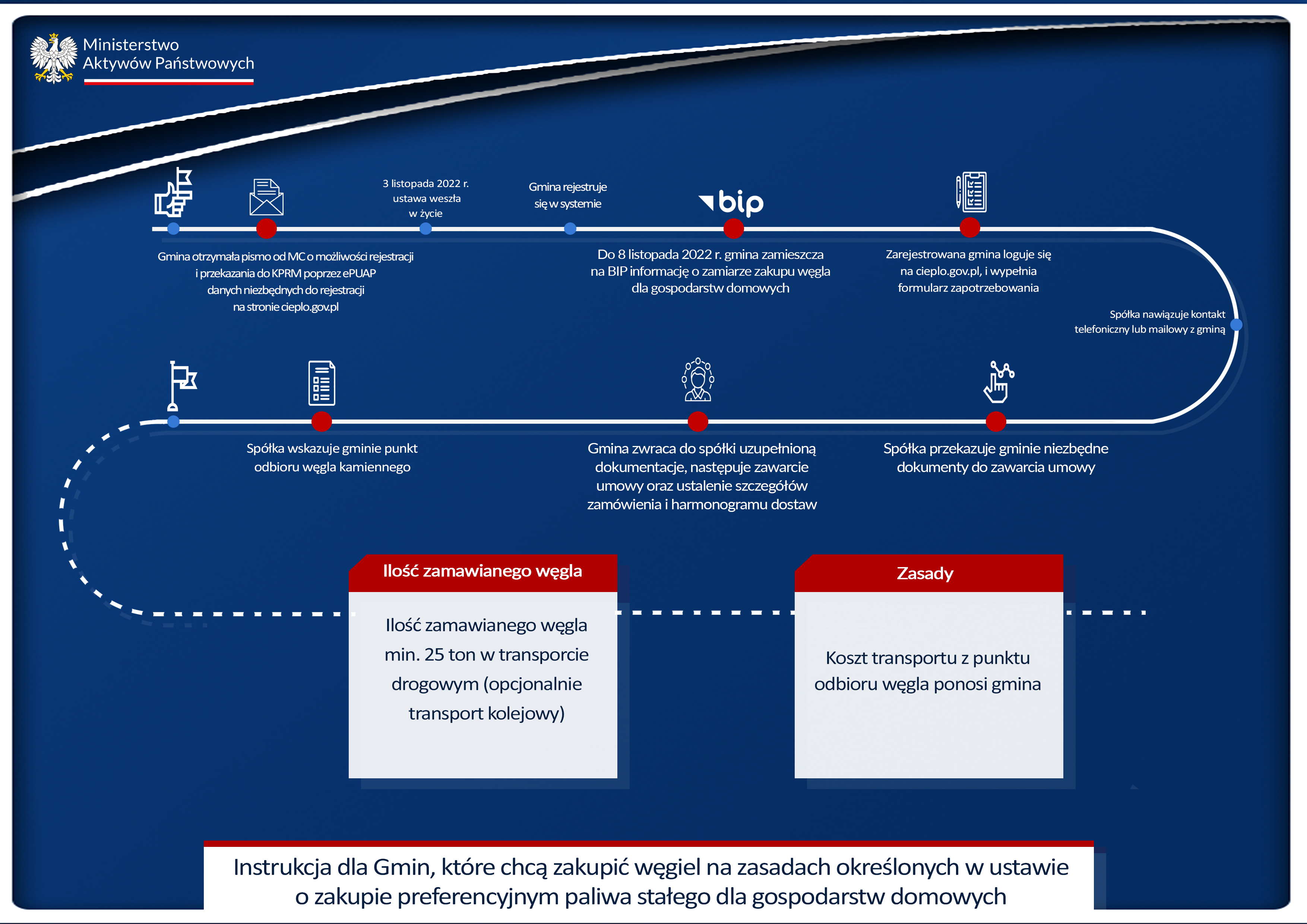 W terminie 3 dni roboczych od dnia wejścia w życie ustawy (art. 33 ust. 1), tj. do 8 listopada, do północy, gmina zamieszcza w swoim BIP informację, że zamierza kupić węgiel dla gospodarstw domowych. W tym celu zobowiązana jest wypełnić formularz na stronie www.cieplo.gov.pl. Następnie, gmina czeka na kontakt mailowy lub telefoniczny od spółki, który następuje do kilku dni roboczych. Spółka przekazuje gminie niezbędne dokumenty potrzebne do zawarcia umowy. Po podpisaniu umowy zostaje ustalony harmonogram dostawy i miejsce odbioru surowca. Koszt transportu i wybór sposobu dystrybucji węgla dla gospodarstw domowych leży po stronie Gminy. W przypadku, kiedy gmina nie zajmie się dystrybucją węgla, może do tego zgłosić się gmina sąsiednia albo prywatny skład.