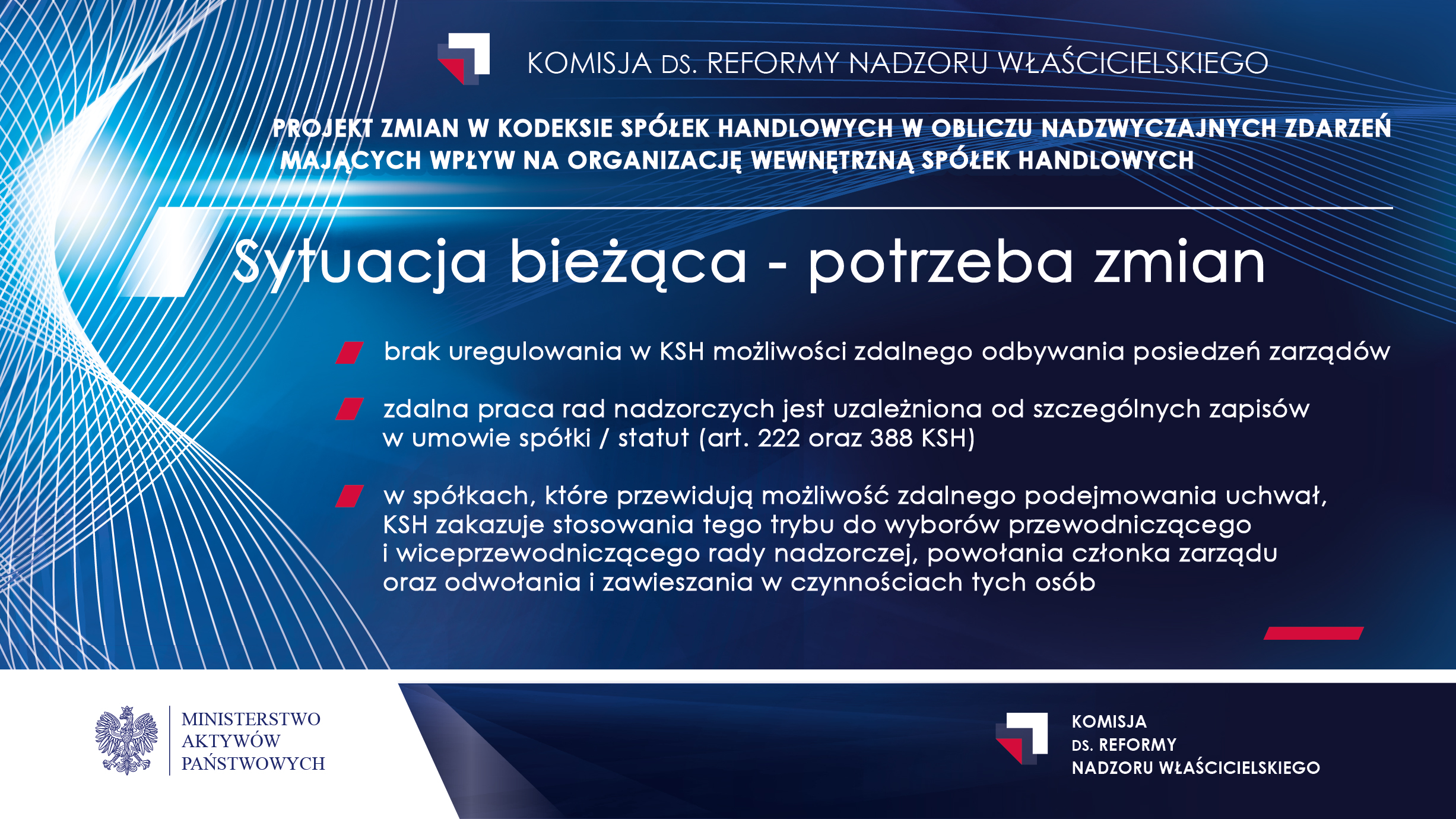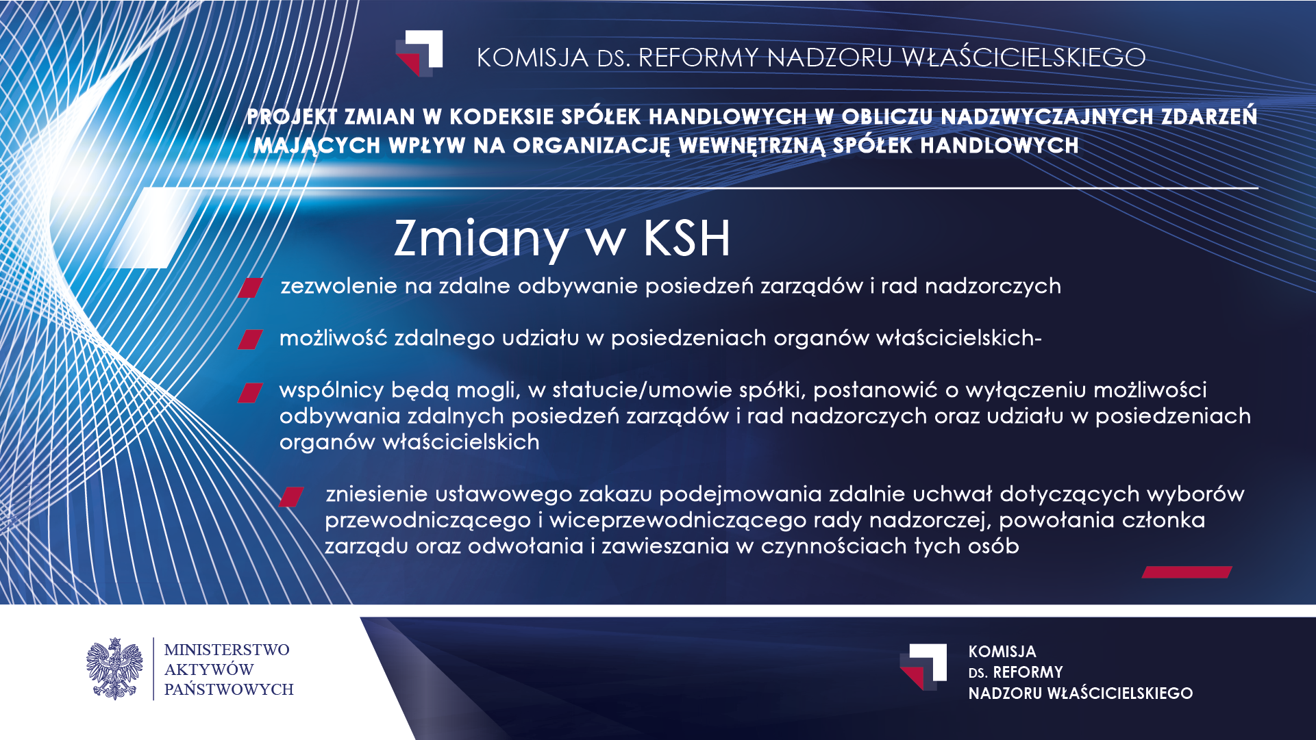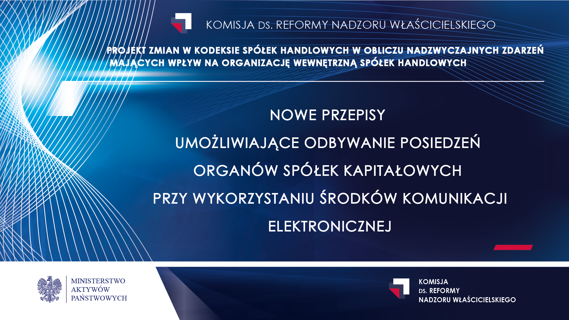 W rządowym projekcie ustawy o zmianie ustawy o szczególnych rozwiązaniach związanych z zapobieganiem, przeciwdziałaniem i zwalczaniem COVID-19, innych chorób zakaźnych oraz wywołanych nimi sytuacji kryzysowych oraz niektórych innych ustaw znalazły się rozwiązania wypracowane przez Komisję ds. reformy nadzoru właścicielskiego. Komisja ta działa w Ministerstwie Aktywów Państwowych. Zmiany mają umożliwić odbywanie posiedzeń organów spółek kapitałowych przy wykorzystaniu środków komunikacji elektronicznej.