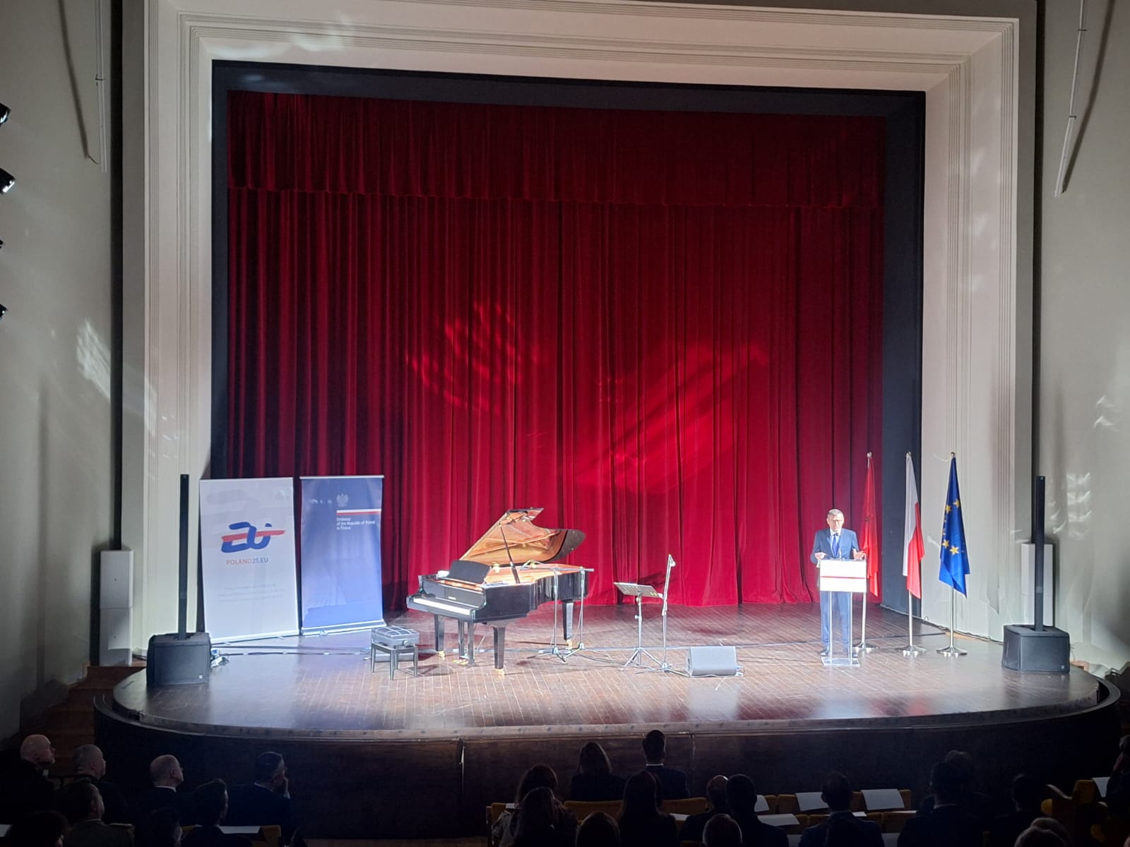 The event took place at the University of Arts in Tirana, where the Polish-Lithuanian duo Jakub Stankiewicz (piano) and Kestutis Vaiginis (saxophone) performed in the main concert hall. The artists performed their own jazz arrangements of the anthems of the European Union countries, which was a reference to the Polish presidency of the Council of the European Union, as well as pieces by composers associated with Poland, Henryk Wars and Victor Young.