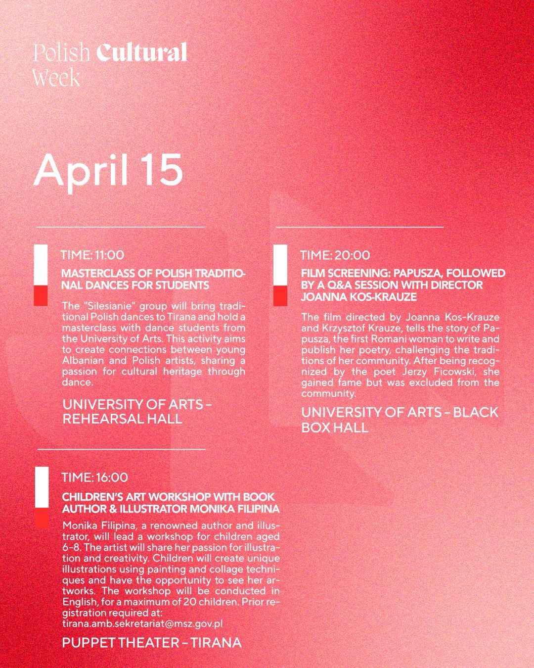 The first Polish Cultural Week in Albania, organized by the Embassy of the Republic of Poland in Tirana with the support of the Ministry of Economy, Culture and Innovation, begins this Monday (14 April). This year, Polish Week will be the first in a series of International Cultural Weeks, held annually in the capital of Albania. The rich program of the Week includes various cultural events: a performance by a folk dance group, film screenings with the participation of a Polish director, a meeting with Polish children's literature, art workshops for children, jazz concerts, volleyball matches under the supervision of Polish coaches and workshops for students of the Albanian University of Arts.