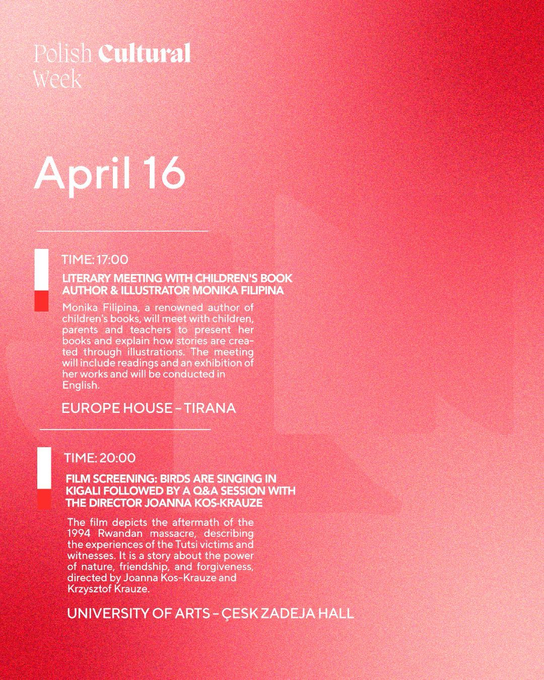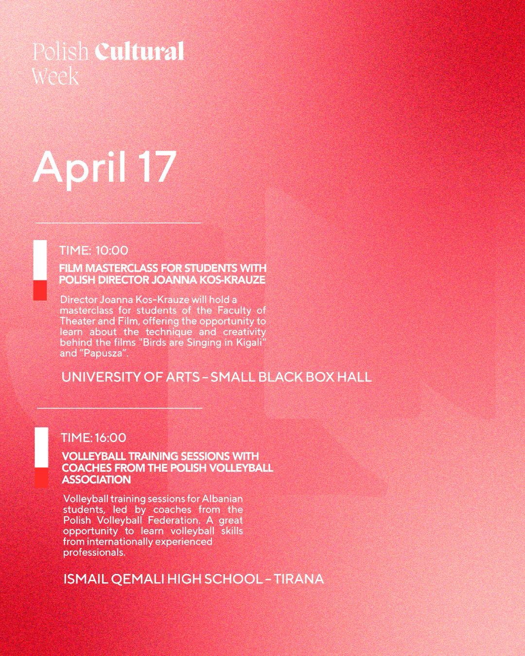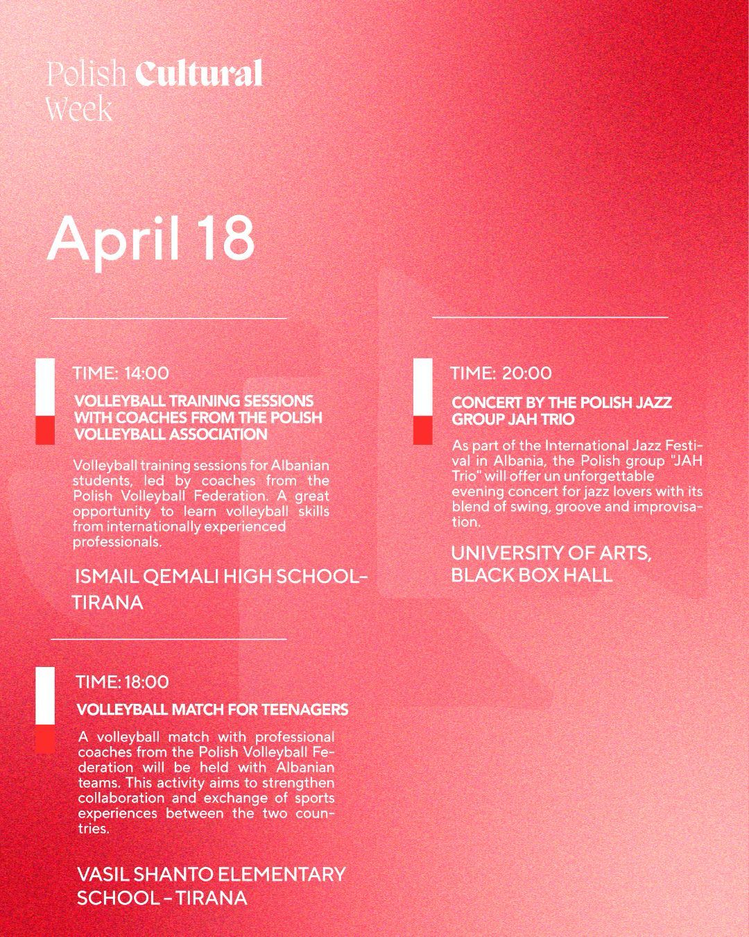 Tydzień Kultury Polskiej 2025 rozpocznie się 14 kwietnia przy instalacji „Chmura” (Reja) w centrum Tirany. Polski Zespół Pieśni i Tańca „Silesianie” wykona tradycyjne polskie tańce i zaprosi publiczność do wspólnego odtańczenia „Poloneza” - tańca wpisanego na Światową Listę Reprezentatywną Niematerialnego Dziedzictwa Kulturowego Ludzkości UNESCO. Na scenie towarzyszyć im będzie albański zespół tańców ludowych (Ansambli i Këngëve e Valleve Popullore). Następnego dnia odbędą się warsztaty dla studentów z Wydziału Tańca Akademii Sztuki, którzy będą się uczyć tradycyjnych polskich tańców.
