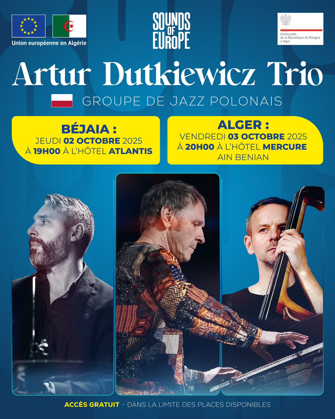 Notre voyage musical européen à travers l’Algérie se poursuit, cette fois avec le groupe polonais 🇵🇱 Artur Dutkiewicz Trio, pour deux concerts de jazz à #Béjaïa et #Alger 🇩🇿.
