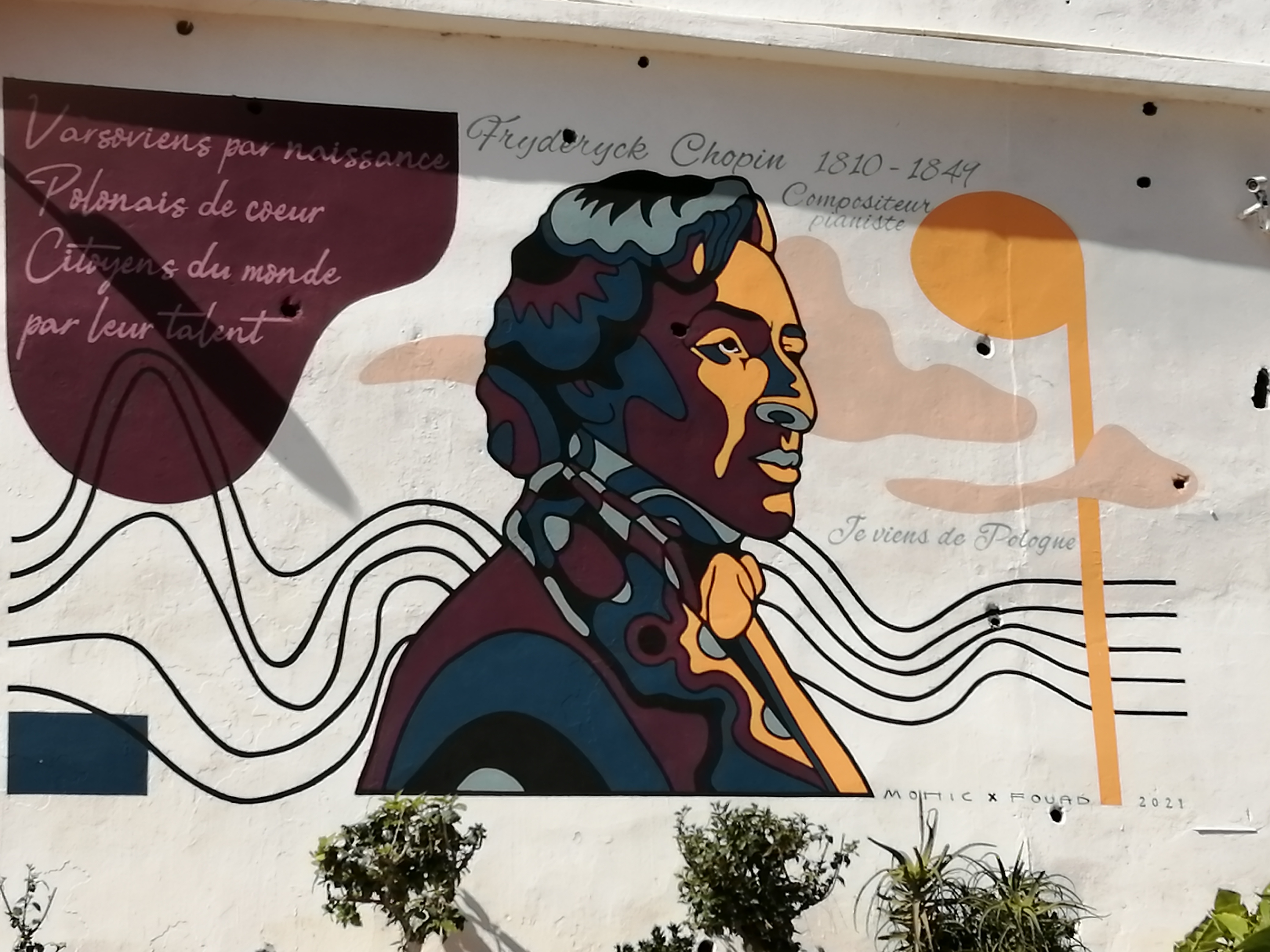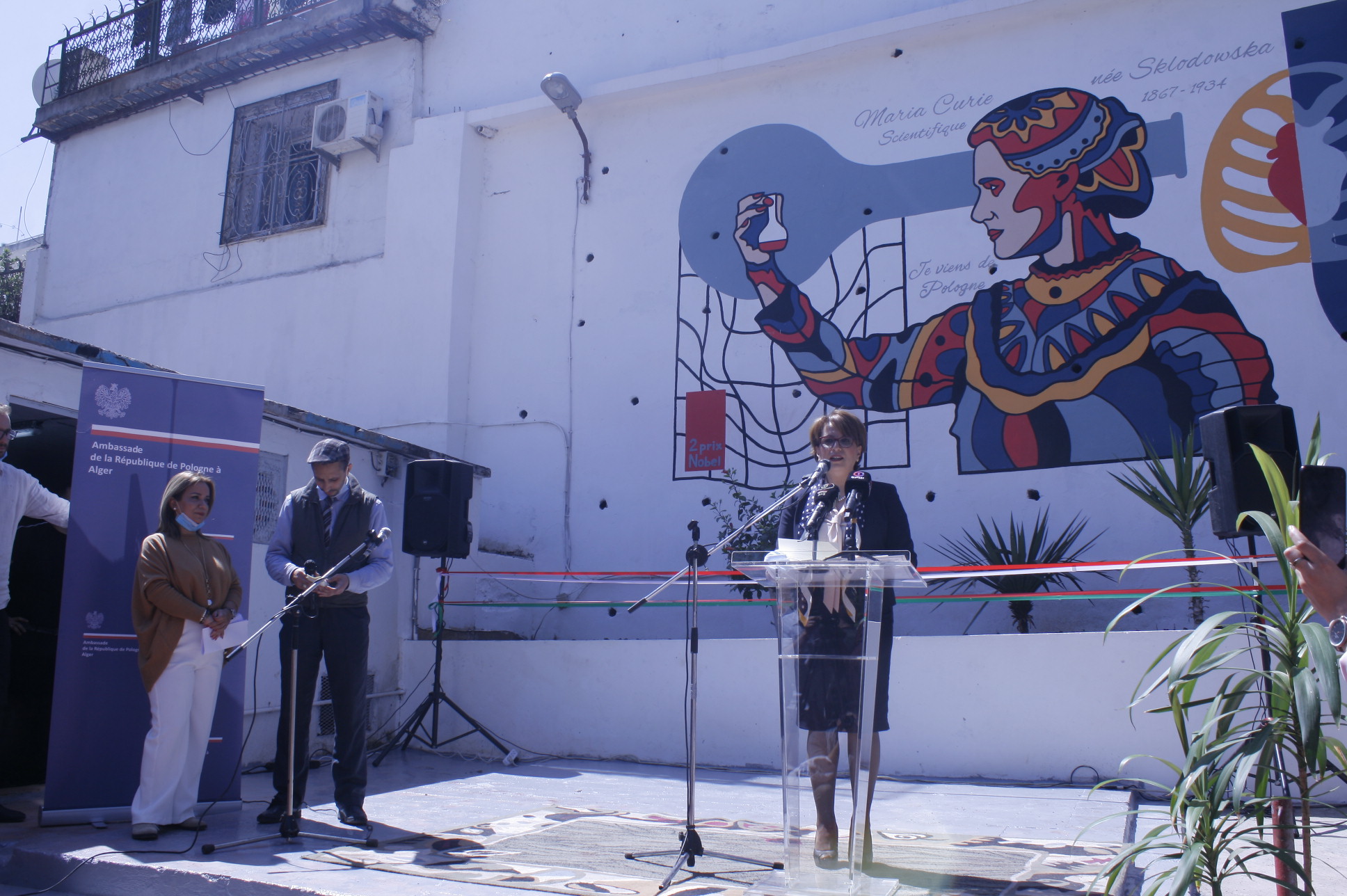 Le 29 mars voir à l’Ecole supérieure des beaux-arts (ESBA) à Alger a eu lieu le dévoilement de la fresque murale présentant Marie Skłodowska-Curie et Fryderyk Chopin. L’évènement s’est déroulé en présence de la Minister de la Culture de l’Algérie Malika Bendouda et l’Ambassadeur de la Pologne à Alger Witold Spirydowicz. Le projet, initié par l’Ambassade de Pologne, a été réalisé en excellente coopération avec l’ESBA et sous l'égide du Ministère de la Culture de l’Algérie. Les auteurs sont de jeunes artistes plasticiens algériens: Mohamed Marzouk « Mohic » et Fouad Yahiaoui, qui travaillaient sous la direction de M. Jaudet Gassouma - professeur et le Directeur de la Faculté des Beaux-Arts de l’ESBA.