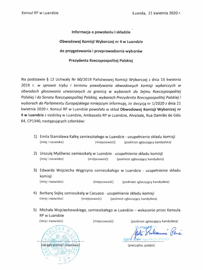 Poniżej publikuje się informację o powołaniu i składzie Obwodowej Komisji Wyborczej nr 4 w Luandzie do przygotowania i przeprowadzenia wyborów Prezydenta RP.