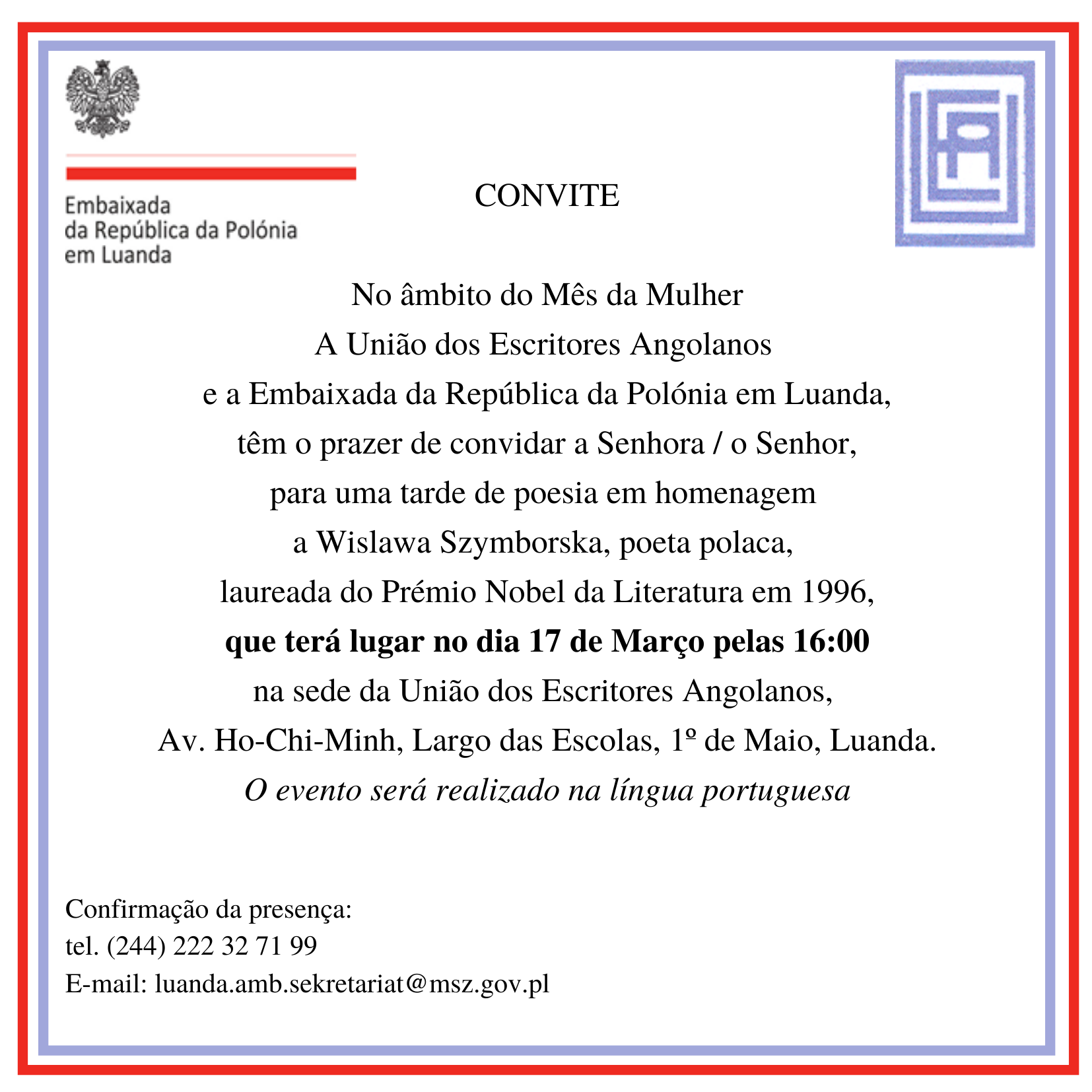 Ambasada RP w Luandzie ma przyjemność zaprosić Państwa na spotkanie poświęcone twórczości Wisławy Szymborskiej, polskiej poetki, która w 1996 r. została wyróżniona Nagrodą Nobla w dziedzinie literatury. Wydarzenie będzie miało miejsce w dniu 17 marca br. o godzinie 16.00 w siedzibie Związku Pisarzy Angolskich (União dos Escritores Angolanos), Av. Ho-Chi-Minh, Largo das Escolas, 1˚ de Mayo w Luandzie. Uroczystość odbędzie się w języku portugalskim.