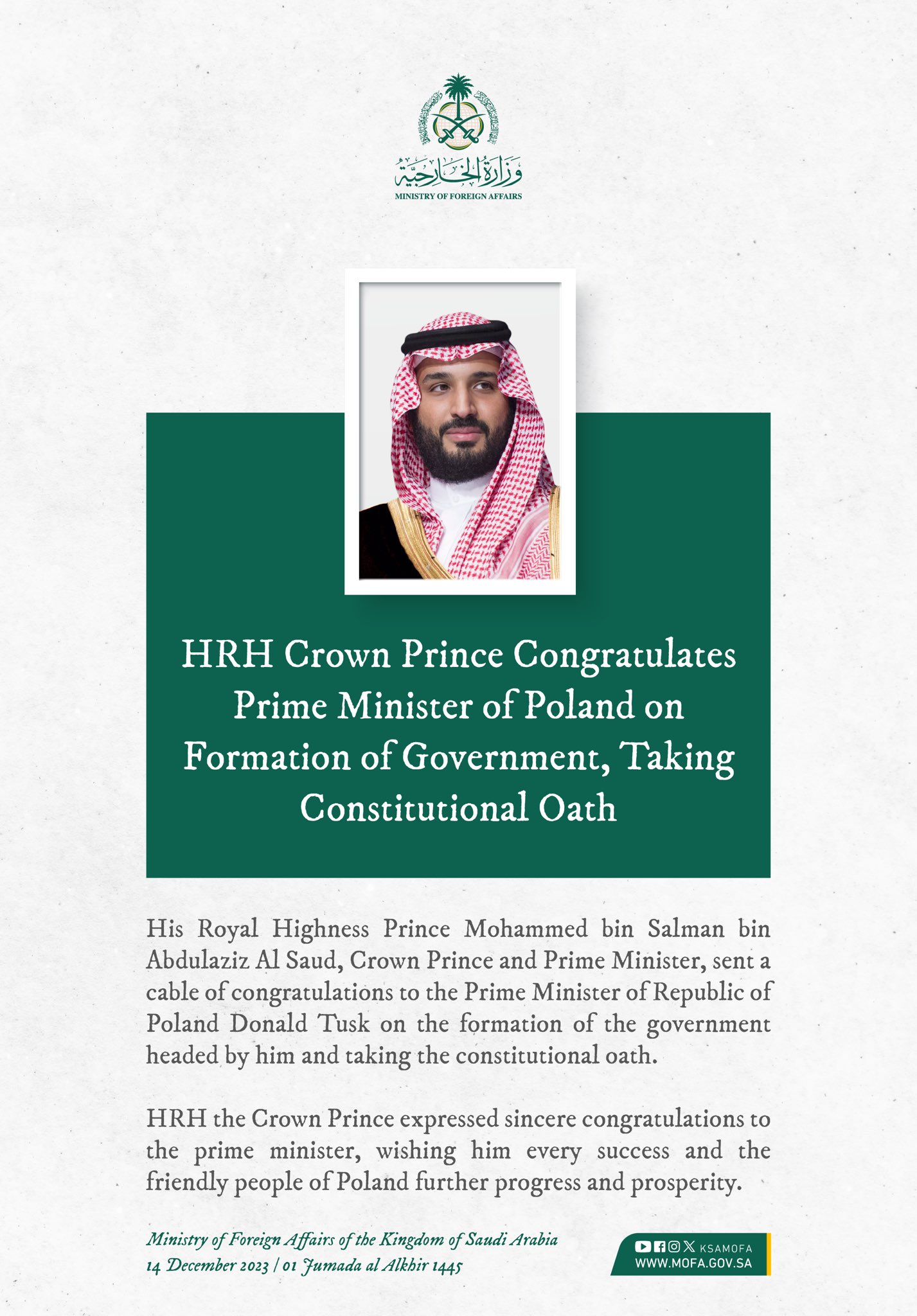 Książę Koronny i Premier Królestwa Arabii Saudyjskiej Mohammed bin Salman złożył gratulacje nowemu Prezesowi Rady Ministrów RP Donaldowi Tuskowi po jego zaprzysiężeniu.