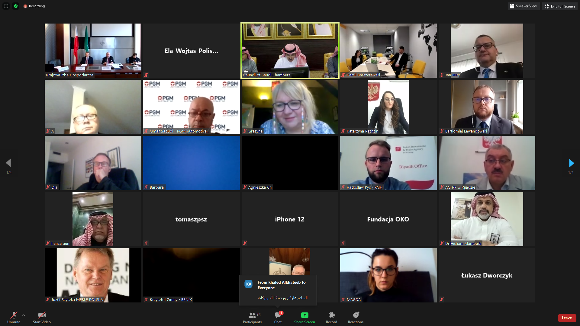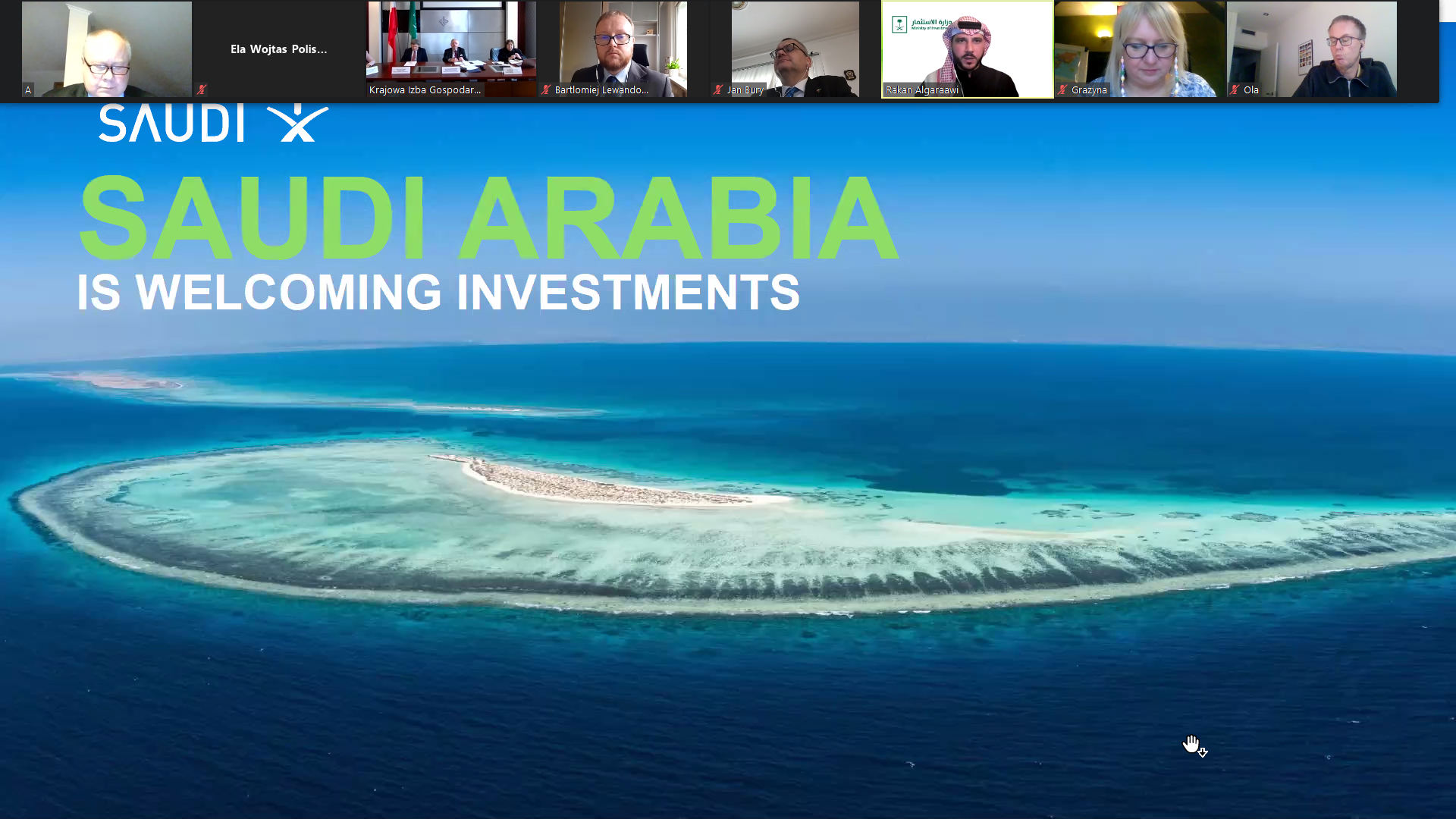 W wirtualnym Polsko-Saudyjskim Forum Biznesu, w dn. 14.12.br., wzięli udział: Prezes Krajowej izby Gospodarczej dr Andrzej Arendarski; Przewodniczący Rady Izb Saudyjskich p. Ajlan bin Abdulaziz Al Ajlan; Ambasador RP w Rijadzie dr Jan Stanisław Bury; przedstawiciel Ministerstwa Spraw Zagranicznych RP - p. Piotr Pniejnia-Olszyński (DWE); przedstawiciele Ministerstwa Rozwoju – p. Bartłomiej Lewandowski, p. Marek Malarski; przedstawiciel Ministerstwa Inwestycji Arabii Saudyjskiej – p. Rakan Al-Garaawi oraz Kierownik Zagranicznego Biura Handlowego w Rijadzie p. Radosław Kyc. Ponadto w spotkaniu uczestniczyli liczni przedstawiciele Krajowej Izby Gospodarczej, Ambasady RP w Rijadzie oraz przedstawiciele kilkudziesięciu firm ze strony polskiej i saudyjskiej.