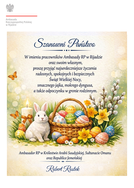 W imieniu pracowników Ambasady RP w Rijadzie oraz swoim własnym, proszę przyjąć najserdeczniejsze życzenia radosnych, spokojnych i bezpiecznych Świąt Wielkiej Nocy, smacznego jajka, mokrego dyngusa, a także odpoczynku w gronie rodzinnym.