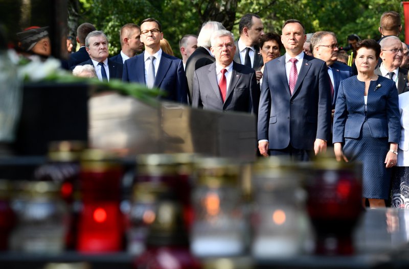 Godzina 17. - "W", o której zgodnie z rozkazem wybuchło powstanie, została uczczona z udziałem przedstawicieli władz, m.in. prezydenta Andrzeja Dudy, premiera Mateusza Morawieckiego, wicepremiera Piotra Glińskiego i kombatantów przy pomniku Gloria Victis na Wojskowych Powązkach.
