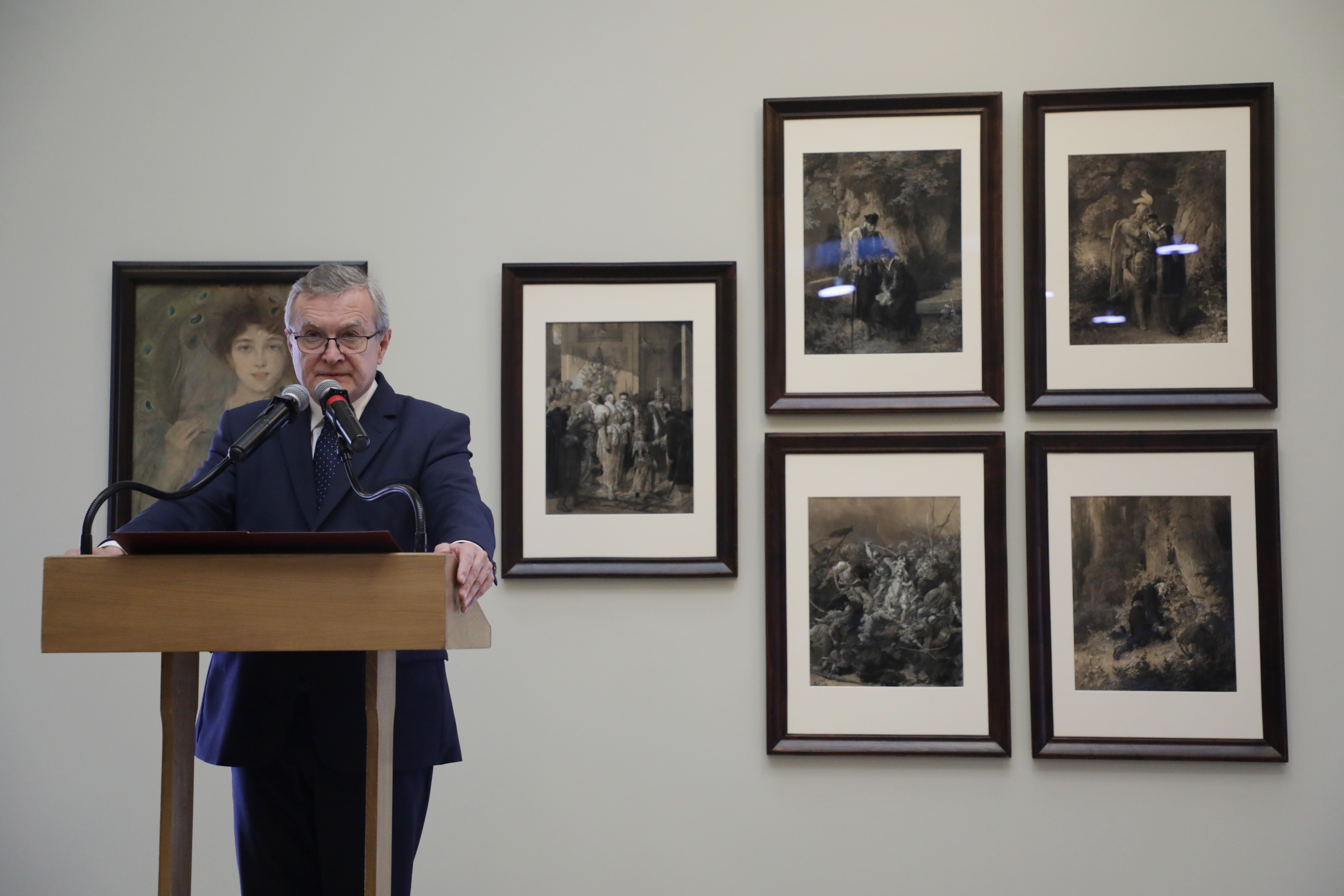 Polska w czasie wojny straciła 516 tys. ruchomych dzieł sztuki (…). Dziś do macierzystych zbiorów, choć historia jest jak zawsze w tych przypadkach dość skomplikowana, powraca przepiękny portret „Dama w pawich piórach”, wykonany w technice pastelu przez Teodora Axentowicza, a także pięć rysunków Michała Andriollego z cyklu ilustracji do utworu „Maria” Antoniego Malczewskiego – powiedział wicepremier, minister kultury, dziedzictwa narodowego i sportu prof. Piotr Gliński. Utracone w czasie II wojny światowej obrazy powróciły do Muzeum Narodowego w Warszawie dzięki staraniom Ministerstwa Kultury, Dziedzictwa Narodowego i Sportu oraz współpracy z organami ścigania. Przed wojną dzieła były własnością Towarzystwa Zachęty Sztuk Pięknych w Warszawie. Spadkobiercą przedwojennej kolekcji TZSP jest Muzeum Narodowe w Warszawie.
