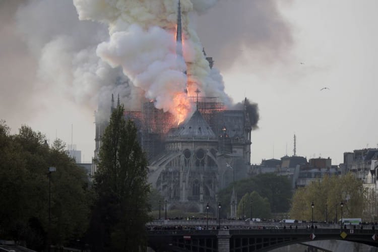 Pożar, który wybuchł w słynnej paryskiej katedrze Notre Dame, udało się w poniedziałek do północy opanować na tyle, że strażacy podali, iż struktura budowli i fasada zachodnia zostały ocalone. Płomienie zauważono przed godziną 19 wieczorem i wkrótce zdjęcia pożaru obiegły media. Pożar wybuchł gwałtownie, obejmując szybko iglicę i dach nawy poprzecznej. Wkrótce rozszerzył się na cały dach. Iglica zawaliła się i spłonęła.
