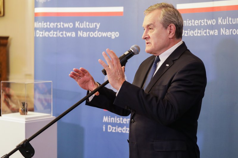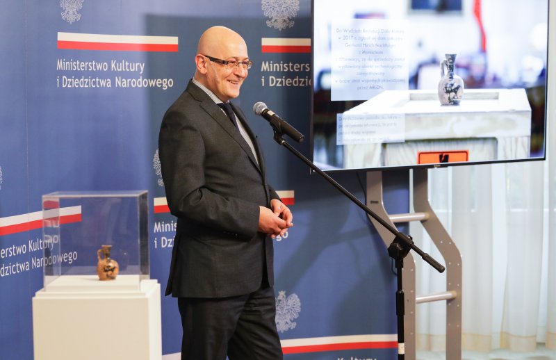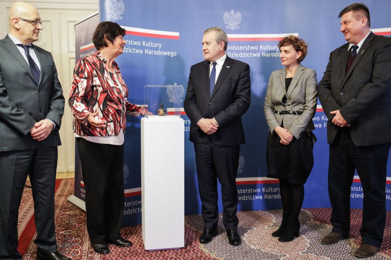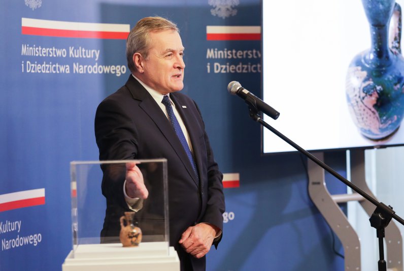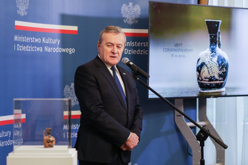 - To nasze kolejne spotkanie z cyklu odzyskanych dóbr kultury, odzyskanych dzięki staraniu naszych pracowników i ich współpracy z wieloma instytucjami. Dzisiaj możemy zaprezentować kolejny obiekt. Lekyt – malutka rzecz, ale bardzo cenna – powiedział wicepremier, minister kultury prof. Piotr Gliński podczas uroczystości w Ministerstwie Kultury i Dziedzictwa Narodowego. Utracony w czasie II wojny światowej lekyt czerwonofigurowy z IV w. p.n.e., który należał do kolekcji Józefa Choynowskiego, został dziś przekazany do zbiorów Muzeum Narodowego w Warszawie. Jest to pierwszy odzyskany przez Polskę zabytek archeologiczny.