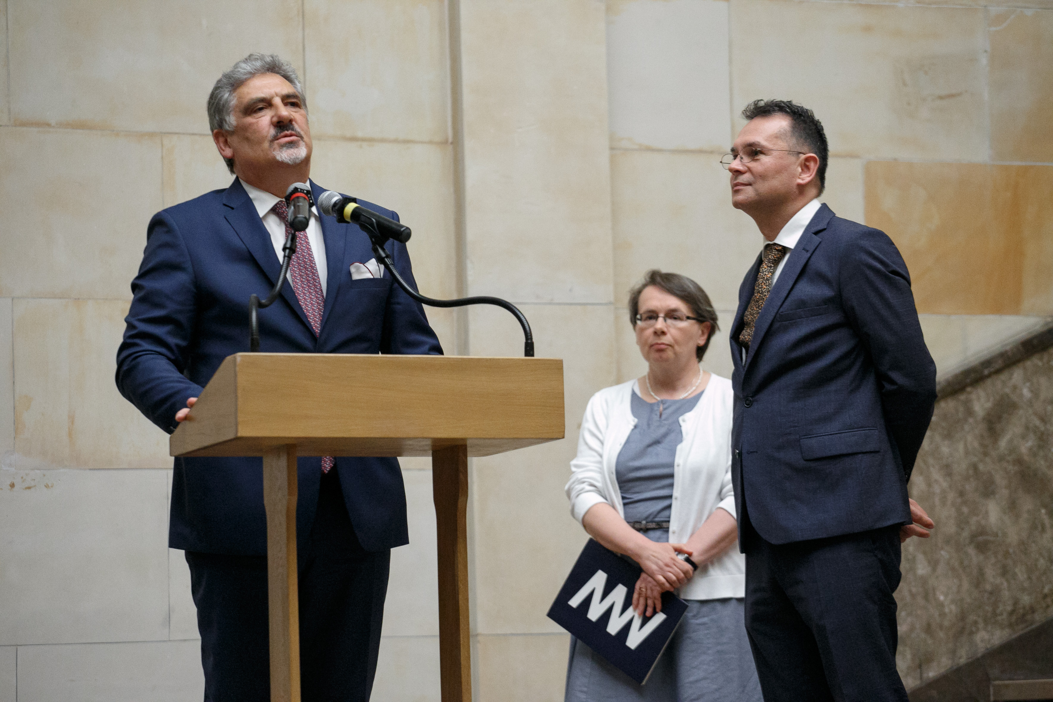 - Chcielibyśmy, i to jest na pewno zasługa dyrektora Jerzego Miziołka, korzystać z tego, co Muzeum Narodowe w Warszawie posiada. A posiada olbrzymie zbiory, które na ogół są w magazynach, ale powinny być częściej ‘przewietrzane’, częściej pokazywane - mówił dziennikarzom wicepremier, minister kultury i dziedzictwa narodowego, prof. Piotr Gliński podczas otwarcia pokazu "Na jednej strunie: Malczewski i Słowacki" w cyklu Skarby Muzeum Narodowego w Warszawie.