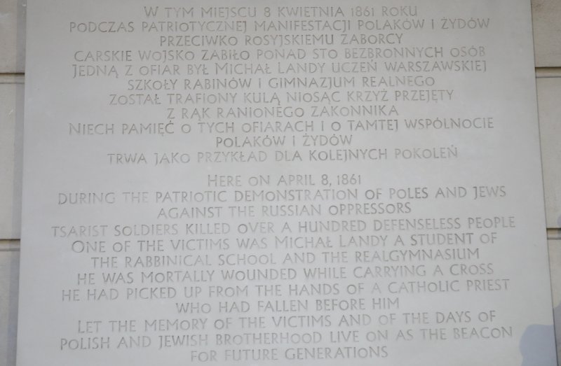 8 kwietnia 1861 r. na Placu Zamkowym w Warszawie odbyła się wielka patriotyczna manifestacja Polaków i Żydów. Krwawo stłumiona przez Rosjan, zabrała życie wielu bezbronnych ludzi i przeszła do historii jako akt męczeństwa i wspólnoty obu narodów w obliczu zaboru Ojczyzny i carskiej niewoli.