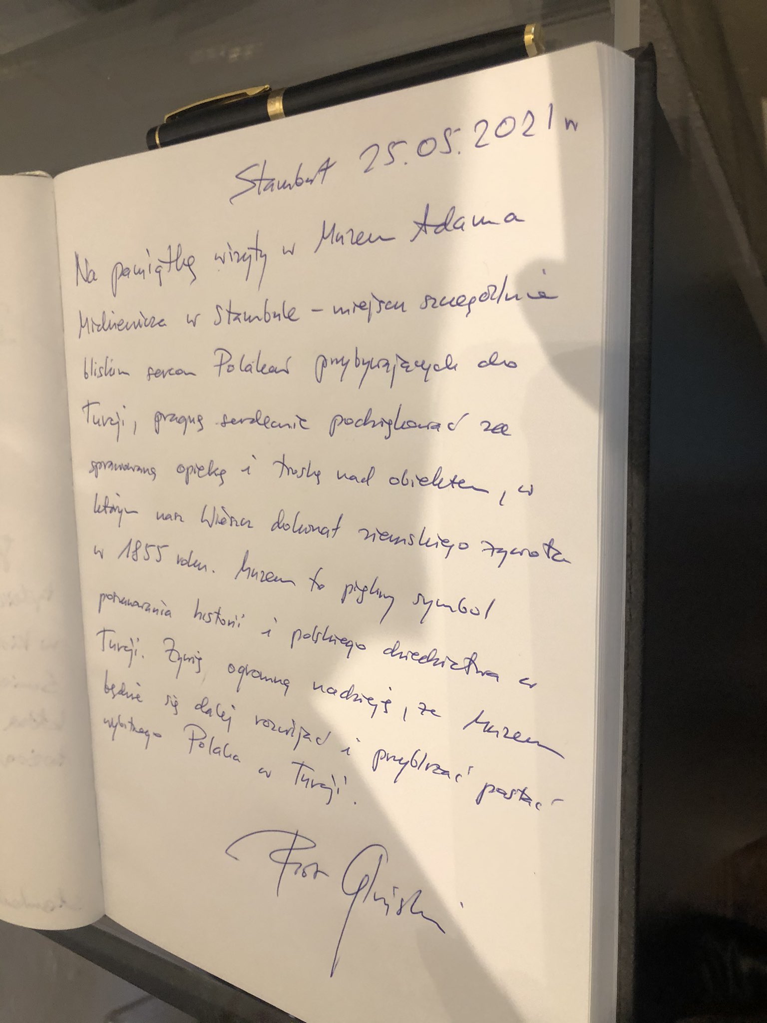 Muzeum Adama Mickiewicza to piękny symbol poszanowania historii i polskiego dziedzictwa w Turcji. Żywię ogromną nadzieję, że Muzeum będzie się dalej rozwijać i przybliżać postać wybitnego Polaka w Turcji – napisał w księdze pamiątkowej muzeum wicepremier, minister kultury, dziedzictwa narodowego i sportu, prof. Piotr Gliński. Podczas symbolicznego otwarcia wystawy po rearanżacji w Muzeum Adama Mickiewicza w Stambule prof. Gliński podkreślał, że nieoficjalnym celem podróży Adama Mickiewicza we wrześniu 1855 r. do Konstantynopola, obecnego Stambułu, była próba tworzenia oddziałów polskich do walki z carską Rosją.