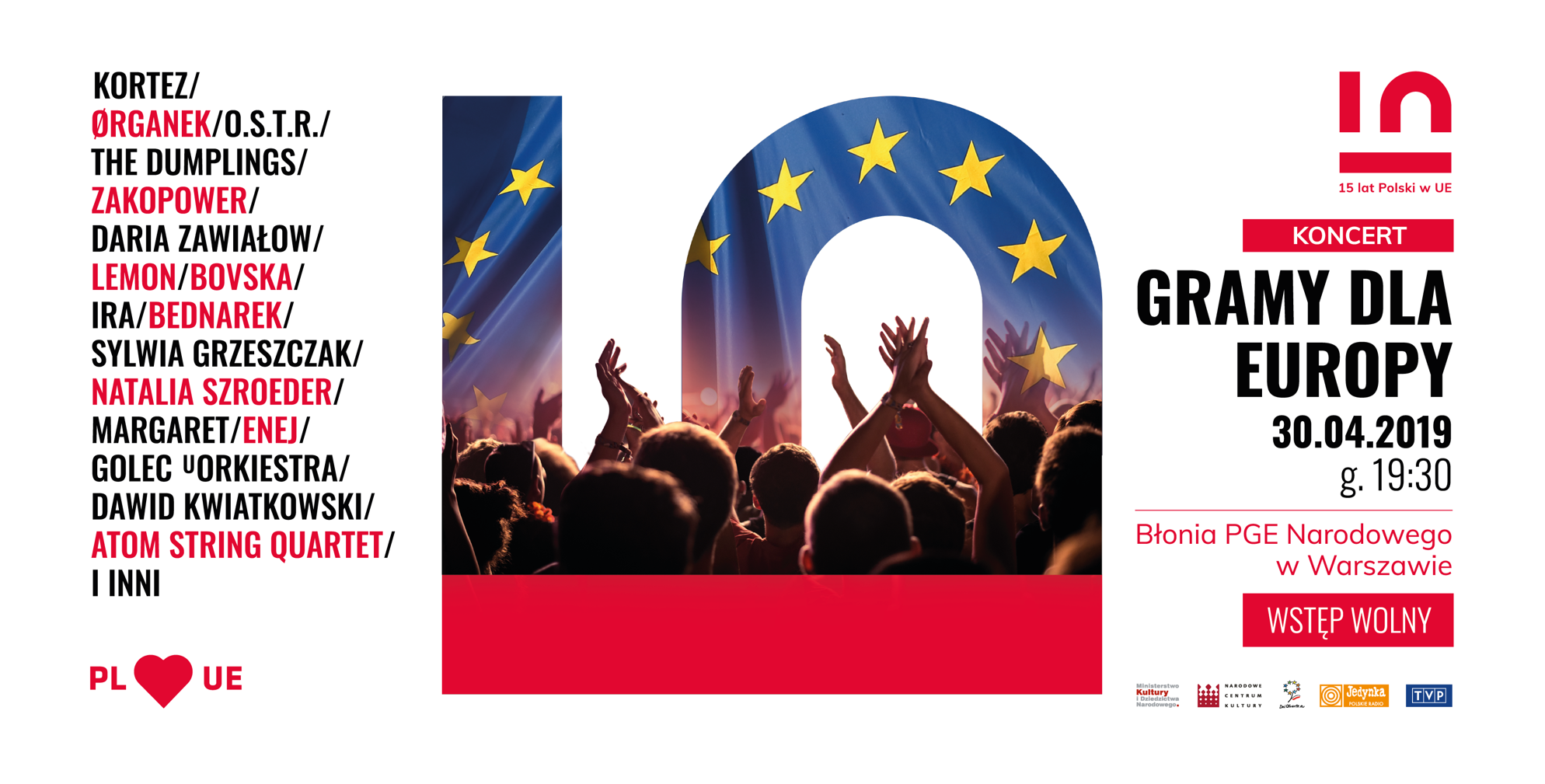 Już 30 kwietnia o godzinie 19.30 widowiskiem „Gramy dla Europy” na błoniach Stadionu Narodowego w Warszawie rozpoczniemy wspólne świętowanie 15. rocznicy wejścia Polski do Unii Europejskiej. Koncert, podczas którego wystąpią największe polskie gwiazdy, zakończy się punktualnie o północy 1 maja, wspólnym symbolicznym odliczaniem od 28 do 1. Każda liczba wybrzmi w języku innego kraju Europy i oznaczać będzie kolejność wchodzenia do struktur Unii. W finale usłyszymy fragment Ody do Radości w wykonaniu muzyków młodego i starszego pokolenia, artystów reprezentujących różne gatunki i style muzyczne, a także chórów, DJ-ów i zespołów.