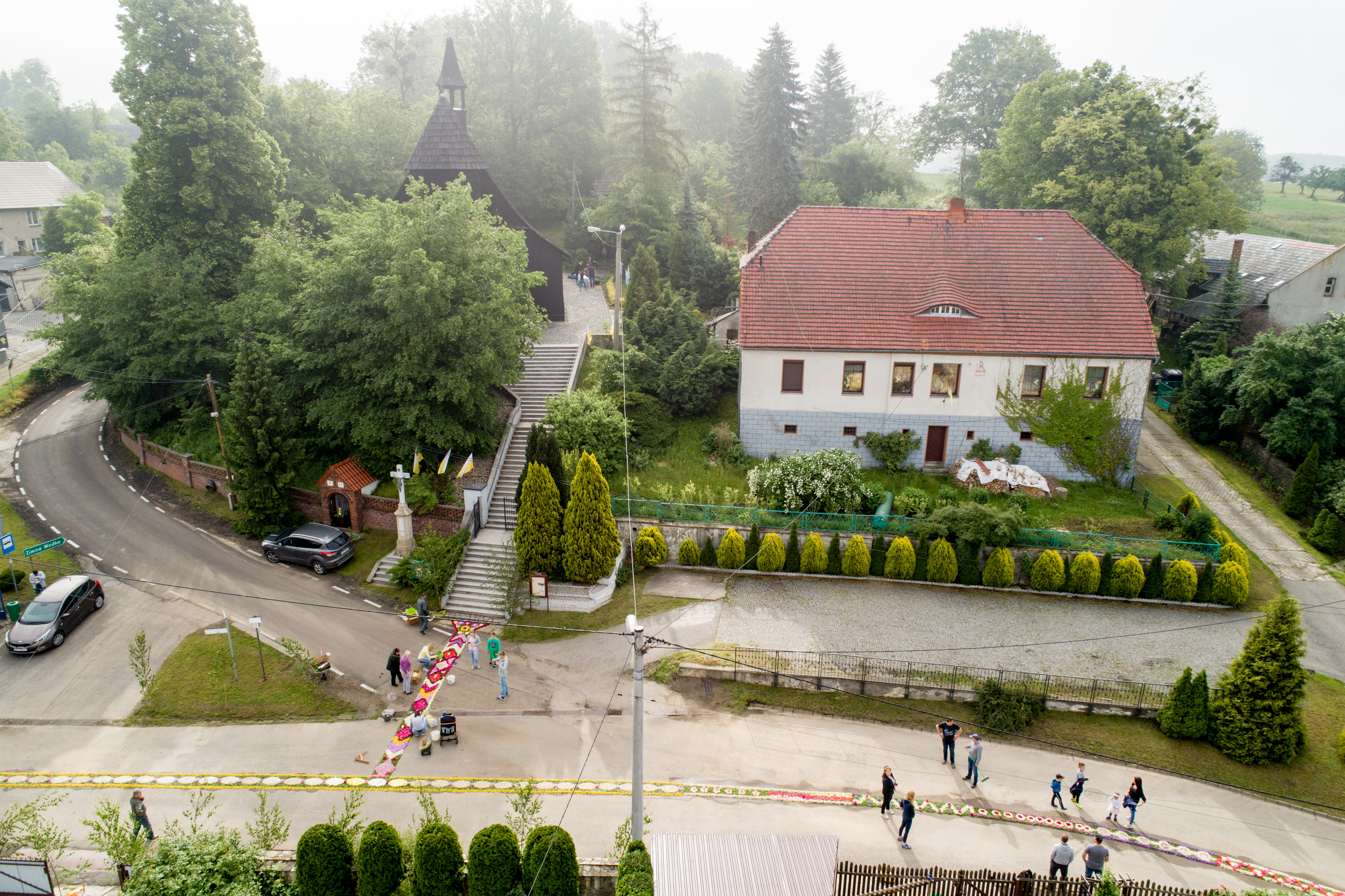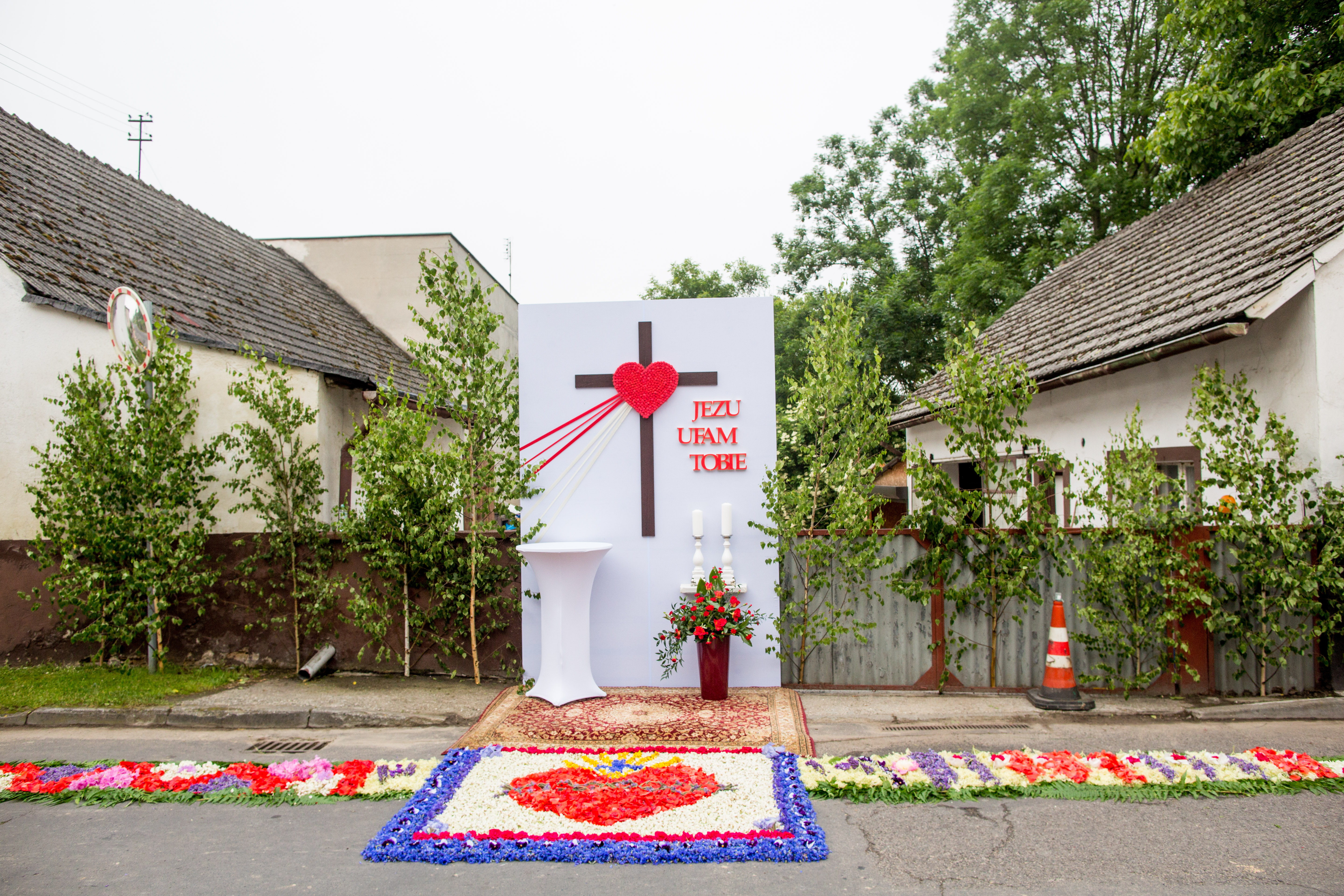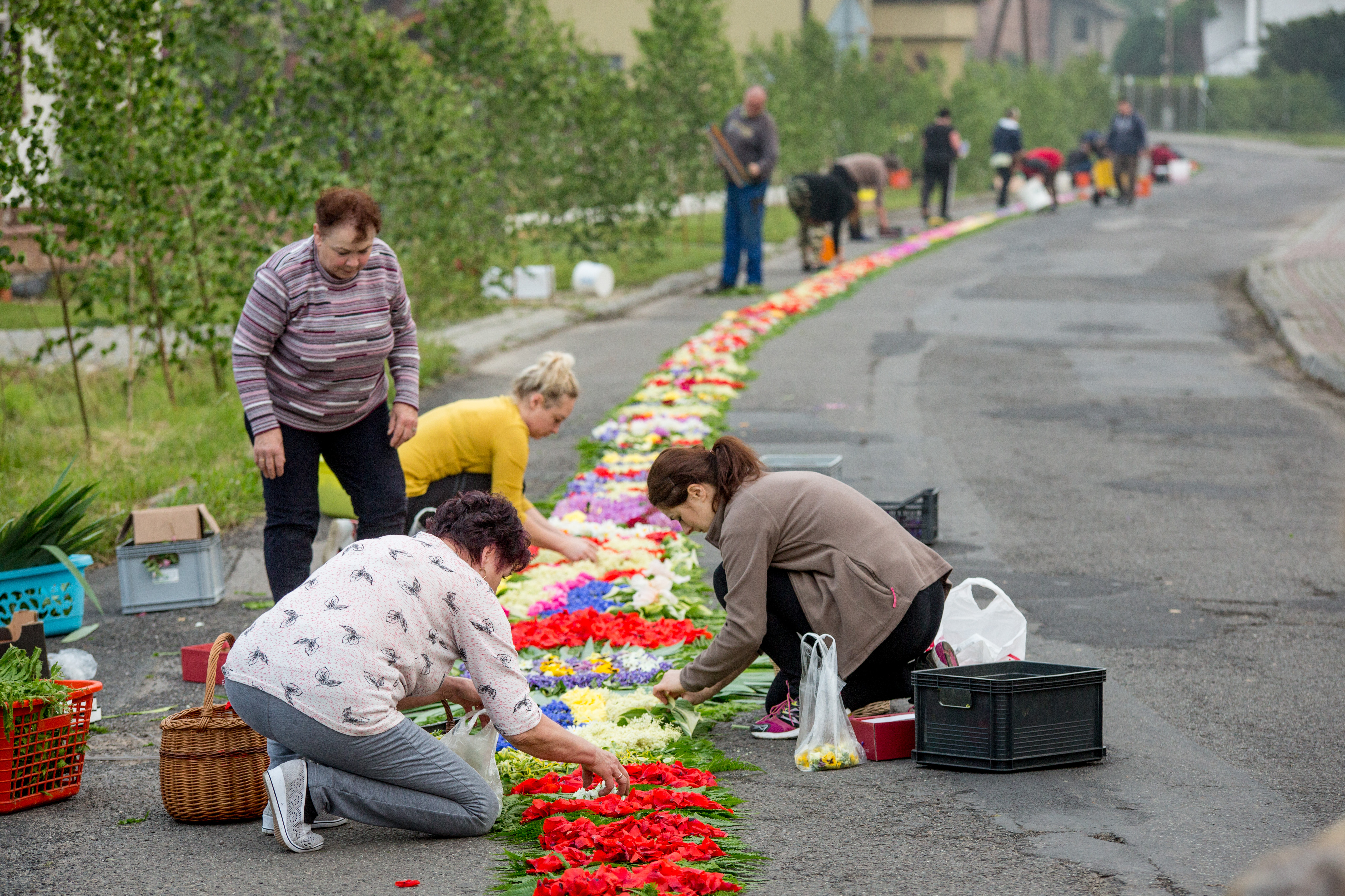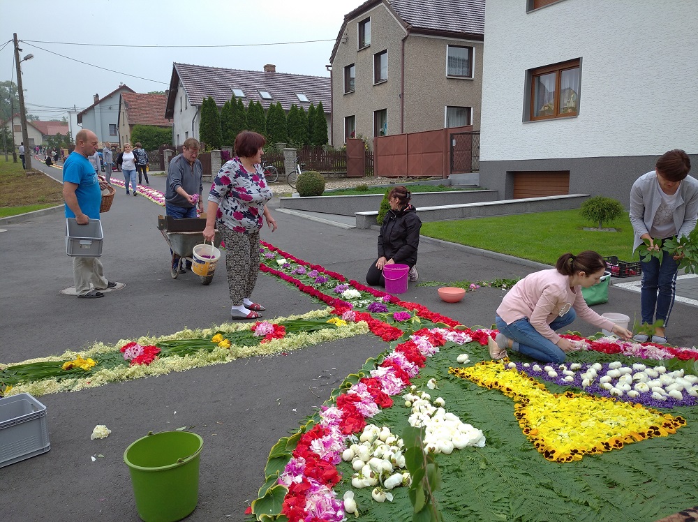 Czwartek jest dniem najbardziej uroczystym w całej parafii, ale i najbardziej pracowitym. Praca zaczyna wcześnie rano od przygotowania drogi jako podłoża dekoracji, posortowania kwiatów i całego materiału dekoracyjnego. Samo ubieranie kwietnych dywanów, będące zwieńczeniem rocznych przygotowań, rozpoczyna się zwykle około godziny dziewiątej i trwa do godzin popołudniowych, w zależności od liczby osób, organizacji pracy czy długości odcinka. Wiele zależy też od warunków pogodowych. Kiedyś istniał dodatkowy problem z rozpoczęciem dekoracji, ponieważ tą samą drogą wypędzano bydło na pastwiska i trzeba było poczekać. Obecnie około godz. 9.00 następuje zmiana organizacji ruchu na terenie parafii – niektóre odcinki trasy są wyłączone z ruchu kołowego, inne muszą być częściowo dostępne i trzeba uważać na wzmożony ruch samochodowy. Około godz. 14.00 parafianie i pomagający im bliscy kończą pracę dekoratorską zmęczeni, ale i dumni ze swego dzieła dla Pana Jezusa. Pozostaje zaledwie parę godzin, by przygotować się do głównej Mszy św. i procesji. Wielu z nich należy do asysty parafialnej, miejscowej orkiestry dętej i Ochotniczej Straży Pożarnej.