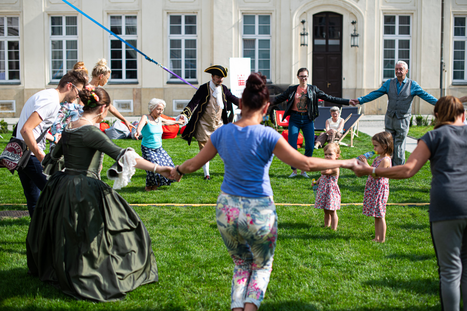 Spotkanie na dziedzińcu rozpoczęło się nauką tańców; m.in. kujawiaka, mazura i oberka. W międzyczasie prowadzący opowiadali licznie przybyłym uczestnikom o etykiecie dworskiej, historii mody, a także sztuce krawieckiej.