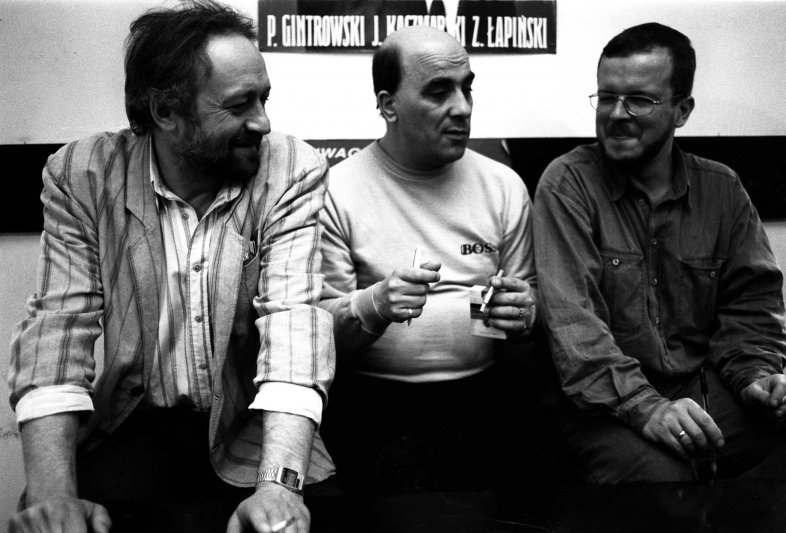 Na zdjęciu: Zbigniew Łapiński, Przemysław Gintrowski i Jacek Kaczmarski, trzej bardowie podczas wspólnej rozmowy między koncertami. fot. PAP/Szwejkowski