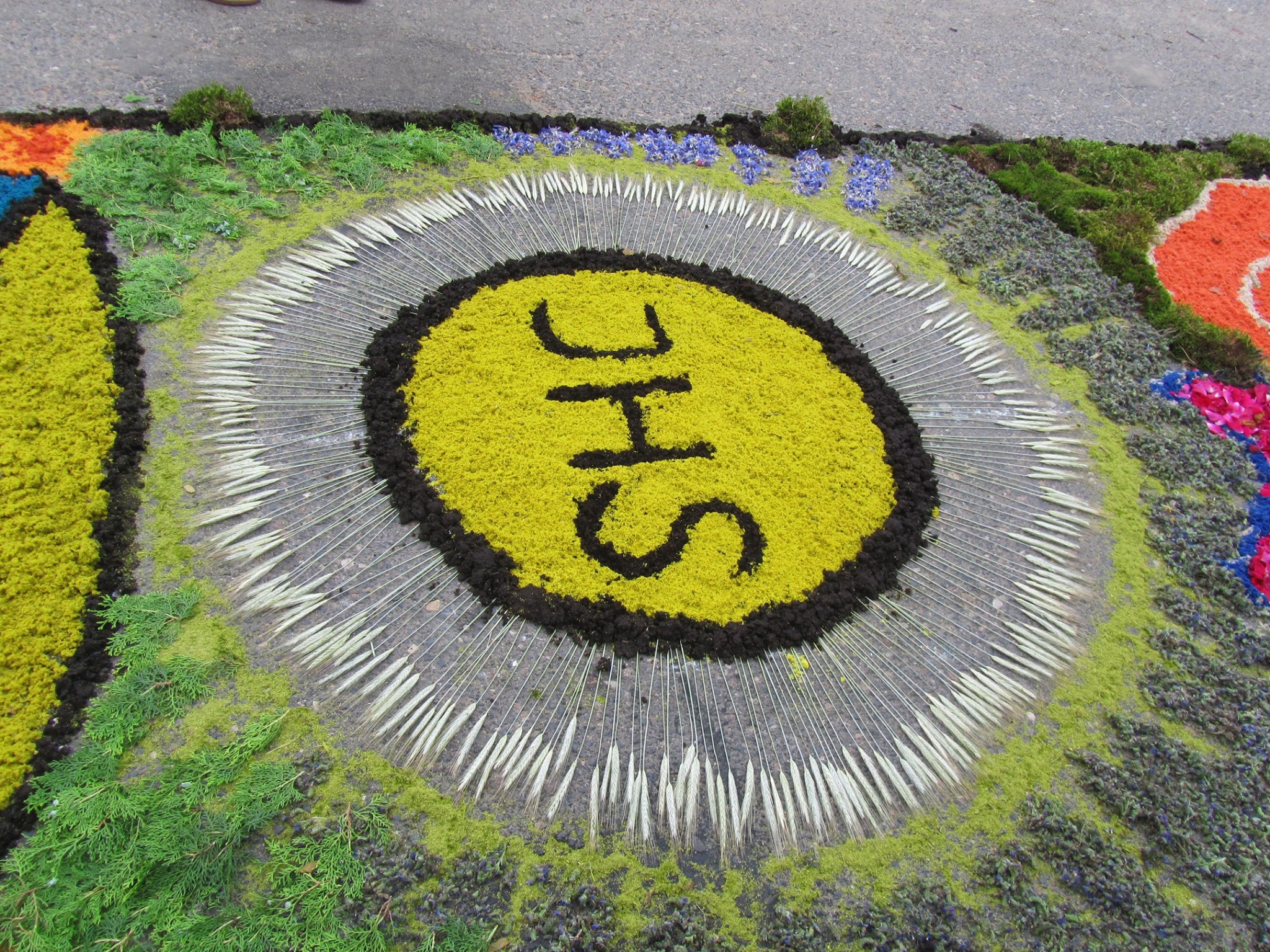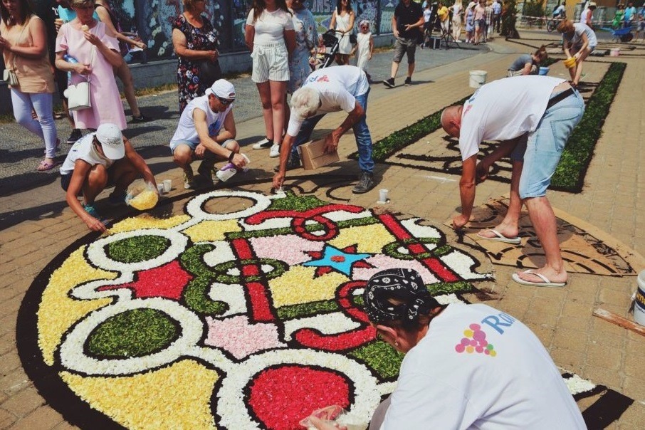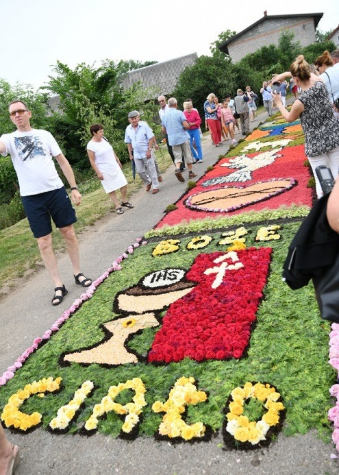 Me llamó atención la presencia de la arena blanca en muchas imágenes, utilizada como base o el relleno de los diseños. Para cubrir se utilizan pétalos grandes como también los pimpollos florales enteros. En Italia, a su vez, se suele utilizar los pétalos triturados que crean la impresión de polvo floral. Además, utilizamos posos de café para los contornos, pero tengo que admitir que aquí también encontré esta técnica en varias obras. Quizás es el efecto de la colaboración entre Polonia e Italia. En Polonia se crea más instalaciones de altares y arcos, pero estos no suelen verse en Italia. Hay un detalle más que llamó mi atención: en Polonia toda la procesión suele pasar por la alfombra instalada de flores. En Italia en cambio este privilegio está reservado únicamente para el cura quien lleva la Santa Hostia. El resto de los participantes de la procesión pasa por sus costados para no dañar la alfombra transformada en un espacio sacro.