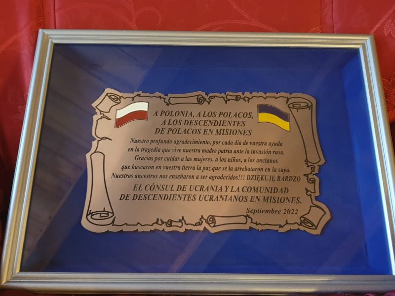 Además, durante los festejos no faltó una referencia a la situación en Ucrania. En el escenario, el Presidente de la Colectividad Ucraniana Sr. Luis Kaleñuk en nombre del Cónsul de Ucrania y de la comunidad de descendientes ucranianos en Misiones entregó al Cónsul Honorario Miguel Skowron y a la Consejera Agnieszka Rymsza una placa con el agradecimiento por la ayuda de Polonia, de los polacos y los descendientes de polacos en Misiones en la tragedia que vive Ucrania ante la invasión rusa.