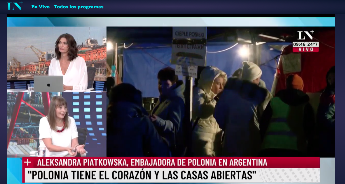 “Todas las personas que huyen de Ucrania debido a la agresión rusa pueden ingresar a Polonia. Damos cobijo a cada persona cuya vida está en peligro, independientemente de su nacionalidad. Ya hemos aceptado a más de 1 millón de personas. Así entienden los polacos la palabra solidaridad”, enfatizó Aleksandra Piątkowska en la conversación con periodistas argentinos. Varios canales de televisión y la radio en Argentina transmitieron las entrevistas con la Sra. Embajadora polaca.