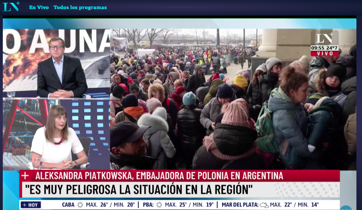 Para nombrar una de ellas; la Embajadora fue invitada del canal La Nación +, donde participó del debate sobre la situación en la frontera este de Polonia, la ayuda humanitaria brindada a los refugiados y la política agresiva de Rusia.