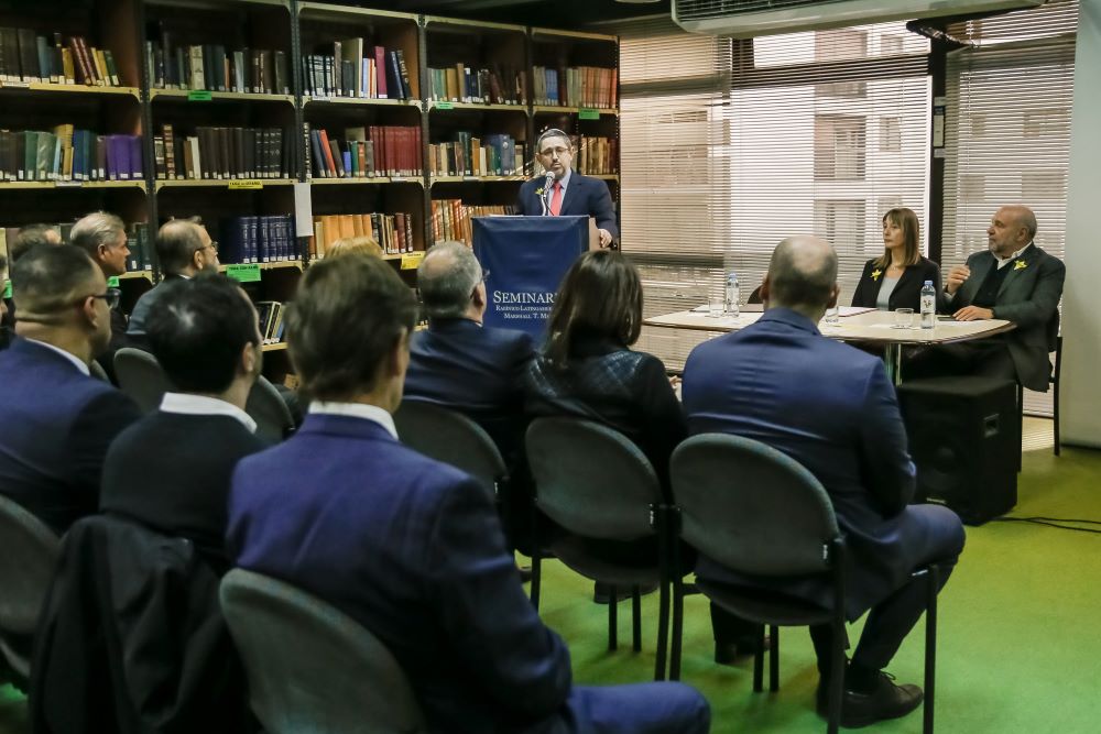 La embajadora polaca Aleksandra Piątkowska junto a las autoridades del Seminario. “Este es un día de memoria y la memoria define las naciones. Es un día de homenaje y el homenaje es una herramienta tanto de la memoria colectiva como la individual. Hoy, 19 de abril, rendimos homenaje a los héroes quienes a pesar de saber de qué iban a morir, querían morir luchando, con la frente en alto. Hace exactamente 80 años bajo las órdenes del representante de los ocupantes de Polonia, un dirigente alemán nazi, Heinrich Himmler comenzó la liquidación final del Gueto de Varsovia. Los jóvenes judíos, miembros de la Organización Judía de Combate y de la Unión Militar Judía, dijeron “no”. Dijeron: no, no vamos a morir de rodillas, lucharemos por nuestras vidas, y si eso falla, moriremos con dignidad. Y esto es lo que hicieron” expresó con mucha emoción la embajadora polaca.
