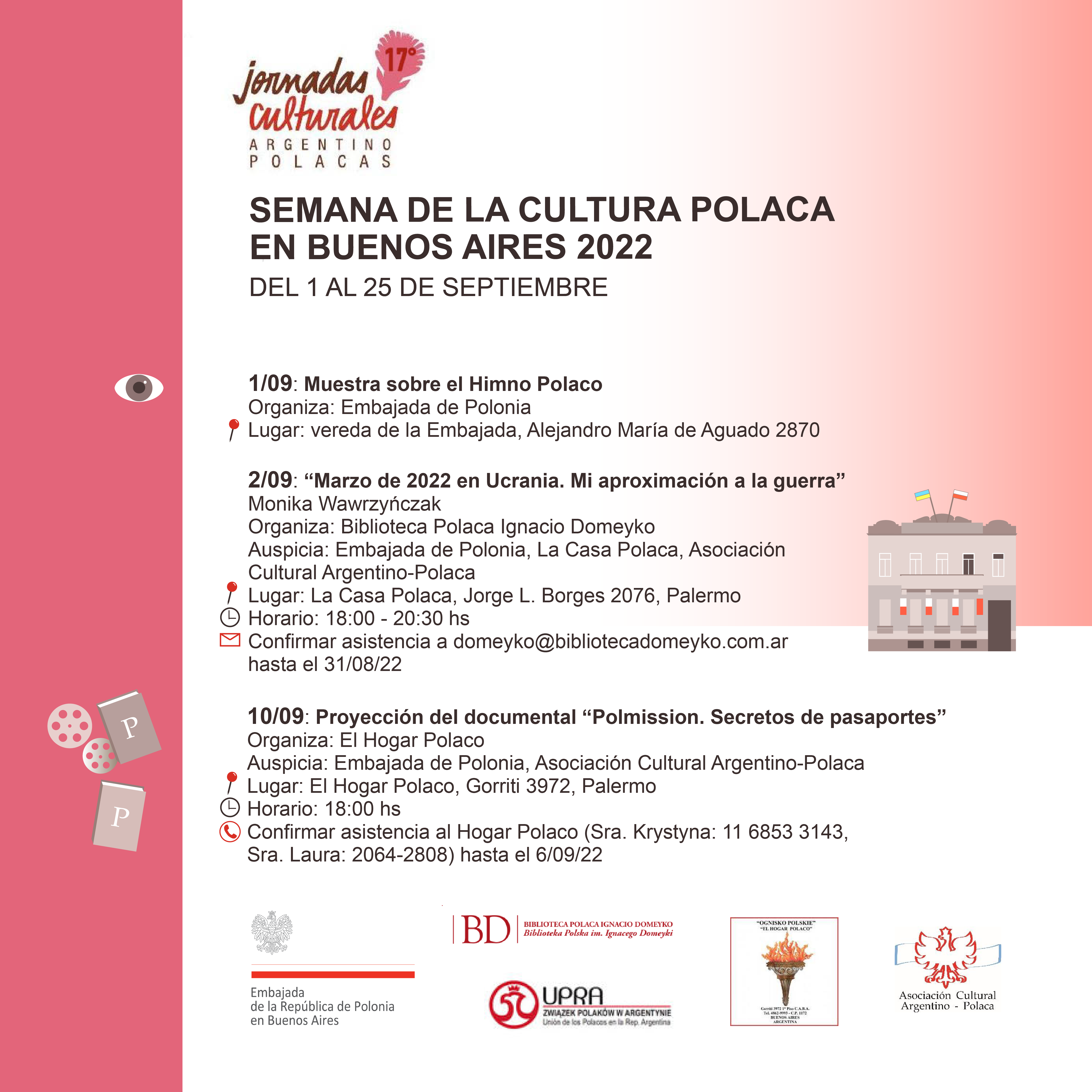 Este año, con motivo de la celebración del centenario del establecimiento de relaciones diplomáticas entre Polonia y Argentina, la Embajada de Polonia en Buenos Aires, junto con las organizaciones polacas y personas privadas, ha preparado un programa de actos culturales en los que se podrá participar durante todo el mes de septiembre.
