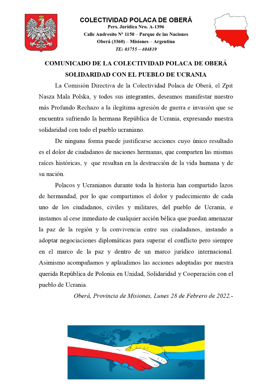 Tanto la Unión de los Polacos en la República Argentina, la Colectividad Polaca de Oberá y ZPIT Nasza Mała Polska, Asociación de Excombatientes Polacos en la República Argentina y también la Comunidad Polaca de Tucumán y el Noroeste Argentino como la Sociedad Polaca Mariscal J. Piłsudski de Montevideo manifestaron en un comunicado oficial su solidaridad con la nación ucraniana y su repudio a la guerra que se desarrolla en estos momentos en ese país.