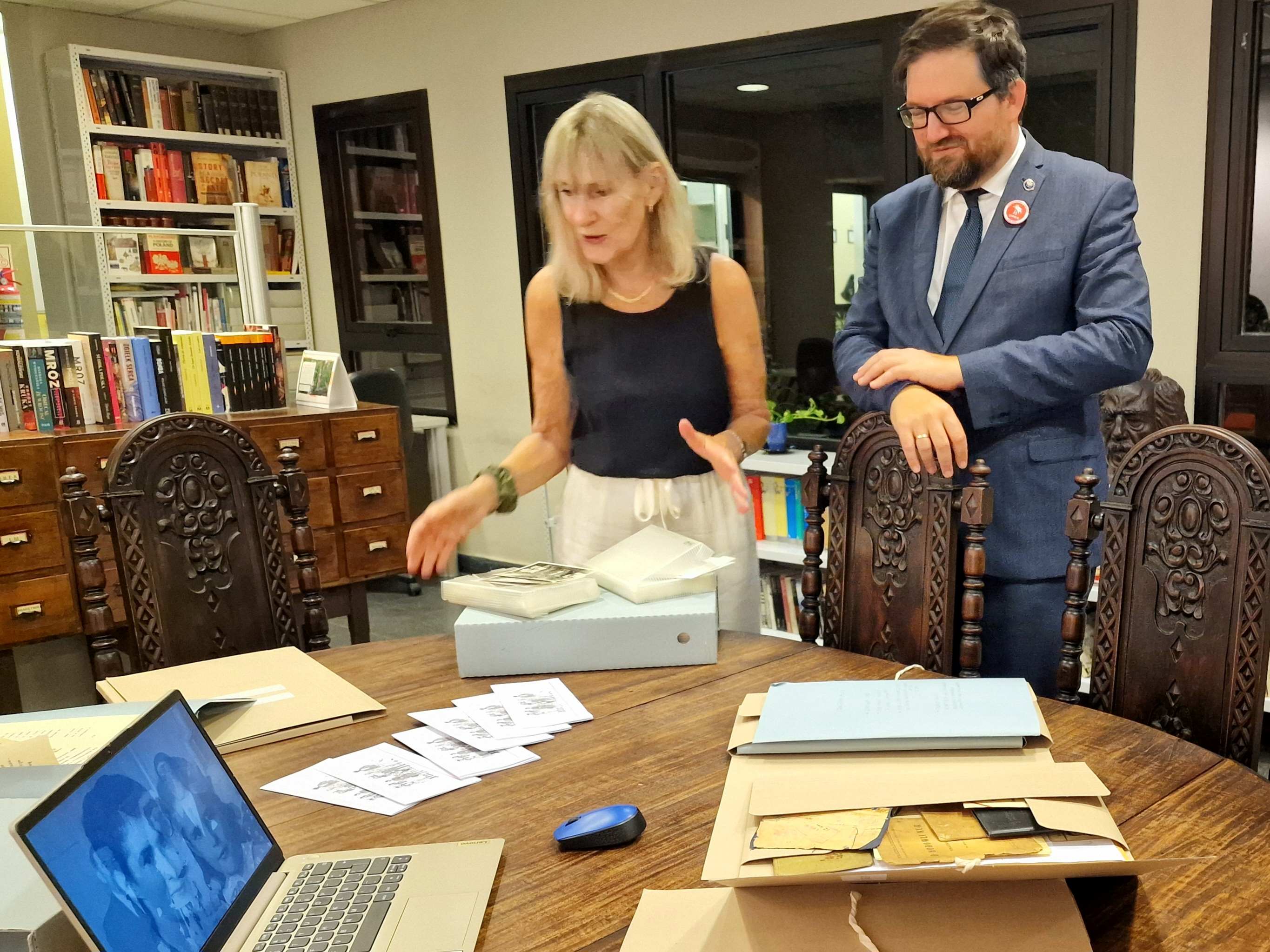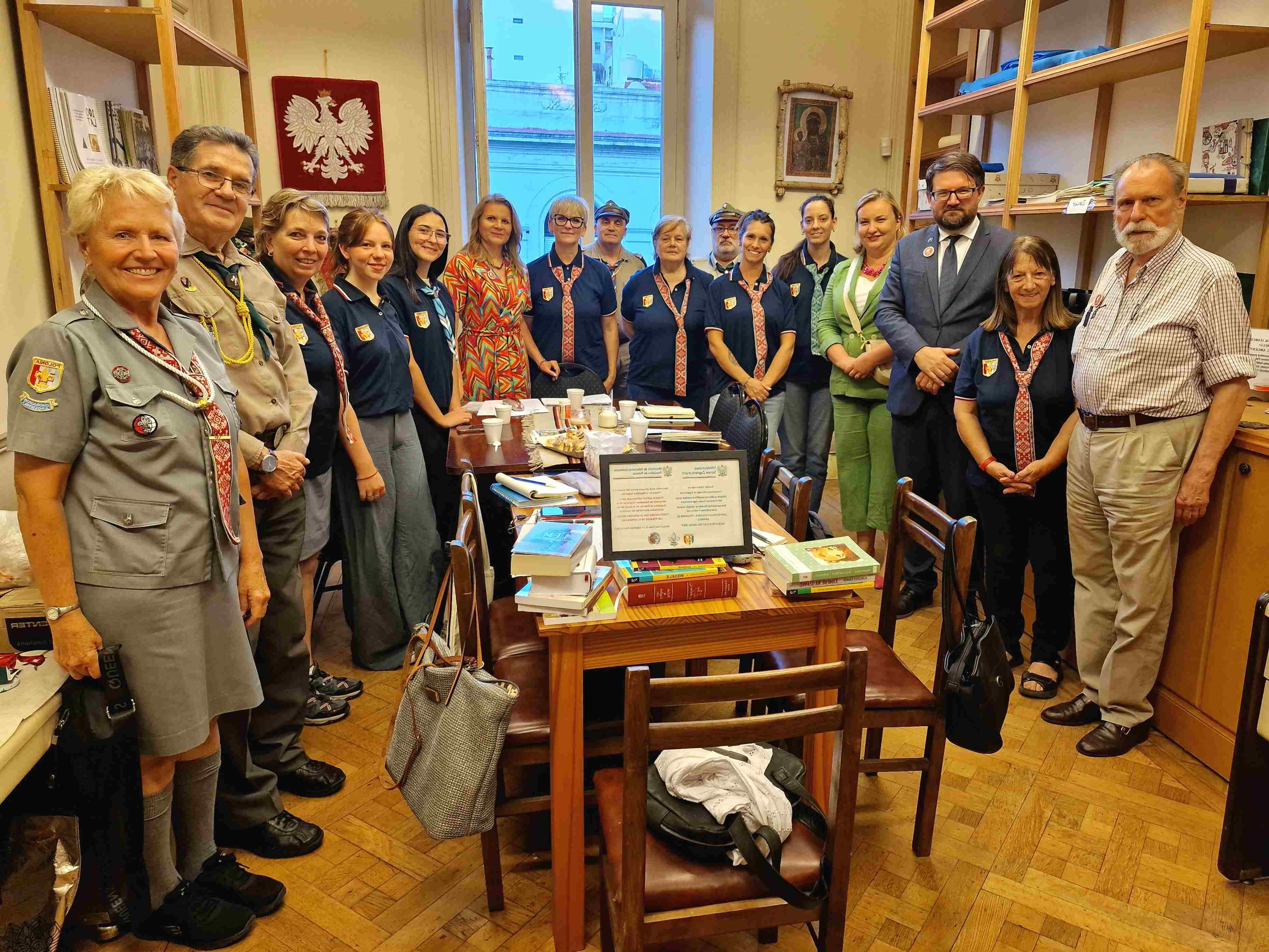 Para concluir la visita, en el Dom Polski de Buenos Aires, y en presencia de la encargada de negocios a.i. de la Embajada de Polonia en la Argentina, Bogna Ruminowicz, y de la cónsul Monika Perendyk, se realizó un encuentro con representantes de la Unión de los Polacos en la Argentina, que este año celebra el centenario de su actividad. Fue también una oportunidad para conocer la amplia labor de la organización: desde la educación para los scouts y las actividades artísticas y folklóricas, hasta iniciativas culturales desarrolladas en la Biblioteca Ignacy Domeyko, donde —además de la conservación y el acceso a sus colecciones— se llevan a cabo proyectos que documentan la historia de las familias polacas en la Argentina, incluido el proyecto original “Familias polacas en suelo argentino”.